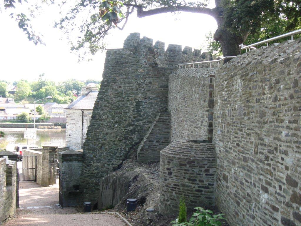 The view along the outside of the southern revetment wall from the south east tower. The road and bridge did not exist in medieval times so the castle was on the riverbank.