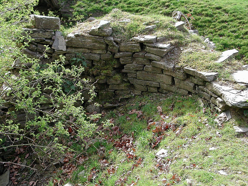 Just south of the current 'entrance' is a protruding wall facing, nearly at right-angles to the run of the curtain wall. Possibly this was a window for a lean-to building or this may even mark the site of the now lost gateway. The castle was four square, apparently with a D-shaped tower at each corner. The south east tower (above) is now best preserved and seems to have walls about 5 feet thick. A minimal defensive thickness, and quite outdated by 1284! The north west tower may have been slightly bigger than its companions and might consequently have been a keep. Much of the west side of the castle has been damaged by the later railway cutting and in several places the core of the old curtain and towers hang precariously over the precipice. The mortar still seen between the stones of the walls is now utterly decayed and without urgent attention it seems likely that more of this failed castle will soon disappear.