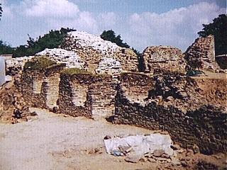 Left: south entrance under excavation, 1994. The rear wall represents alterations by the English in 1277.