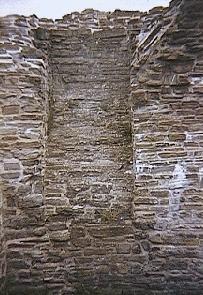 The north range, to the east of the cellar, appears to have been a very large building, and may well have been the castle's hall. This area was really opened out in the 1995 and 1996 excavations, where the top layers produced very little in the way of finds (apart from an interesting piece of anthropomorphic pottery was found (ie decorated with human figures). The level that this area stands at today seems to represent a floor level (as doors and windows are present), but it appears that there may have been a basement area beneath this - possibly connected to the cellar. The south wall of this hall holds a number of doors and windows, which although they are mostly ruined, are still fairly impressive to look at. Towards the east side of the hall is a large masonry block - this probably held a hearth up on a higher floor (similar examples exist at Castell-y-Bere and Dryslwyn).