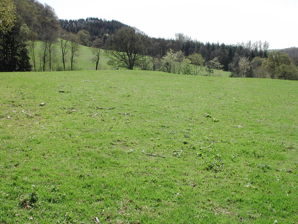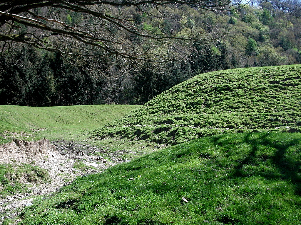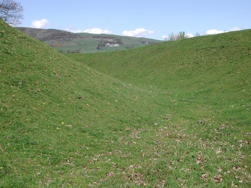 Below: the outer ditch at Sycharth viewed from the area of the bailey below the castle.