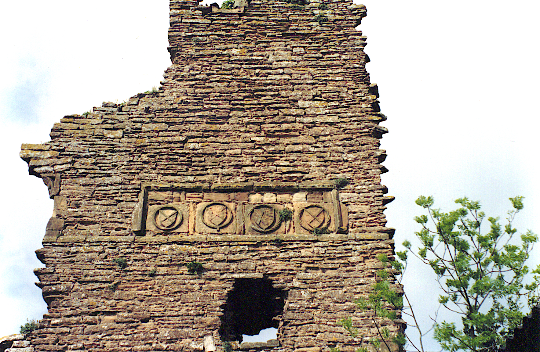 Through the South Gate, we entered the main Apartments. The porch and Grand Stair lead to the apartments in the Fountain Court. The Grand Stair reminded us of a similar structure at Carew Castle. The two most impressive rooms at Raglan are The Hall and Long Gallery. The hall is the finest and most complete of the castle's surviving apartments. A plaque over the dais in the hall bears the distinctive arms of the third earl of Worcester, as Knight of the Garter. Viewing the Great Tower from the apartments, we saw a finely carved shield and badge over the first floor chamber, a good example of the castle's surviving detail. The Long Gallery has been called one of the finest rooms of Tudor rebuilding in Britain. Once a showcase of Tudor elegance, the gallery contained handsome paintings, tapestries and sculptures. During this time, Raglan was one of Britain's social centers. Important guests were entertained until the early hours of the morning. The gallery had a series of windows overlooking the Fountain Court, and an ornate Renaissance fireplace. The remains of the fireplace, clearly showing two carved human figures, are a major highlight of the castle.