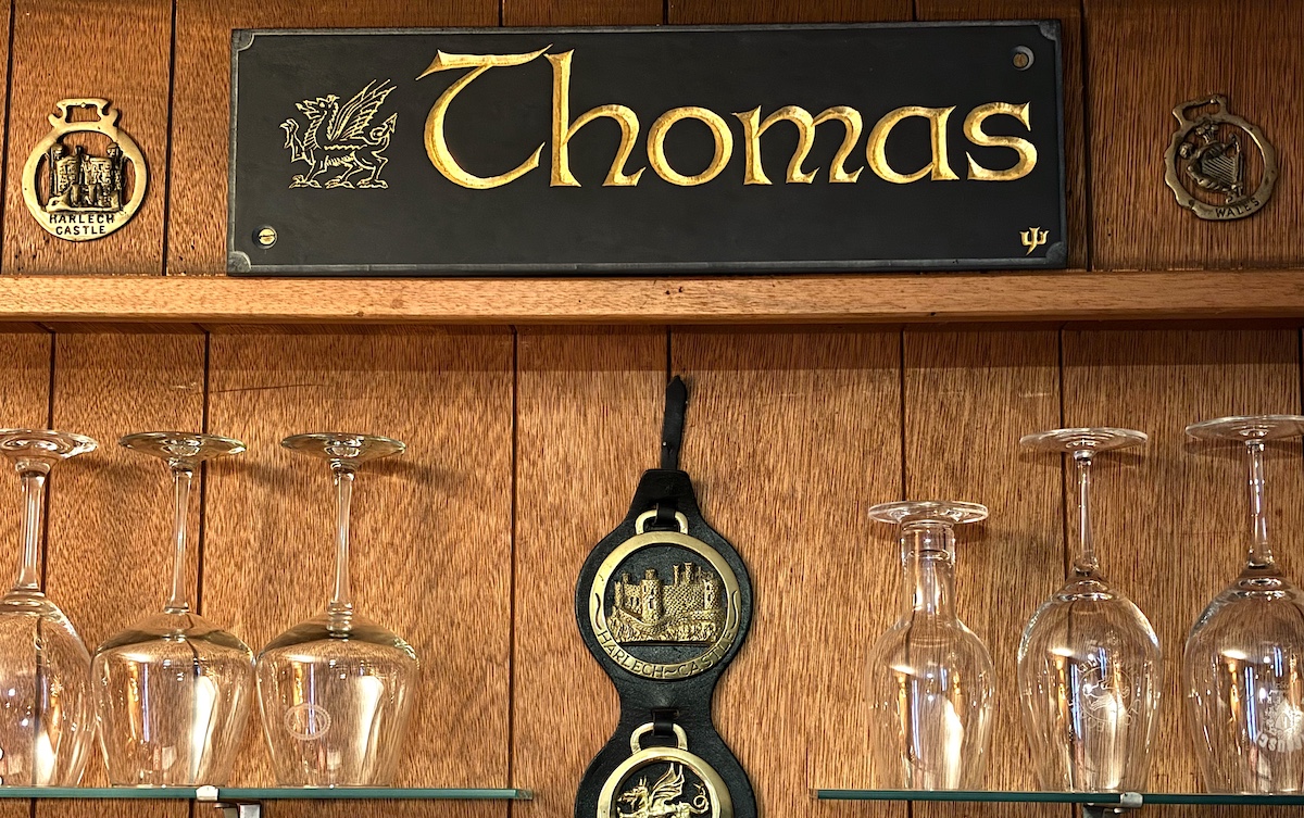During our week in St Davids we kept noticing these decorative signs on houses with the name of the cottage carved in slate. Most of these were rendered in lively colors and we thought they were beautiful. I asked around and found out that the sign maker was a local slate carver. His shop was located nearby and my wife and I decided to pay him a visit. Unfortunately I can't remember his name or the name of his shop. In any case, we met and I expressed interest in having a slate sign made featuring my surname. He suggested a couple of different designs and we settled on a piece with my name next to a Welsh dragon, carved and finished with gold leaf. We settled on a price but he refused to take any type of downpayment, and said we could just mail him a check when we received the sign. I thought that was very generous. We gave him our details and about two months later the sign arrived. It was absolutely beautiful, exactly what I wanted, and has been proudly hanging over the bar in our club room ever since. It's by far the best thing I've ever purchased in Wales.