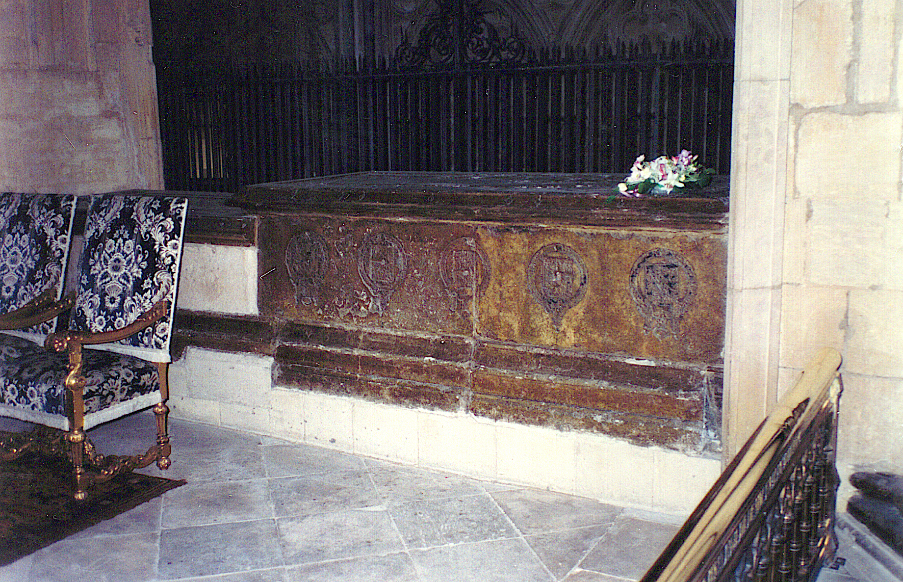 Next we spent time shopping the along Minster Yard, the street that connects Lincoln Castle with the cathedral. Here we stopped in a number of shops and purchased a couple of prints of the city from a local vendor who was set up on the street. We passed several lovely period buildings including a three story Tudor, half-timbered structure with a "To Let" sign on the front. Visiting Lincoln Cathedral was another stop on our "Neville Family" pilgrimage . The cathedral is the final resting place of Katherine Swynford, and her daughter Joan Beaufort. Kathrine was the third wife of John of Gaunt, son of King Edward III, and arguably one of the British Middle Ages most pivotal figures. Gaunt (through his first wife) was the founder of the Lancastrian dynasty (Henry IV, Henry V, and Henry VI). John and Kathrine's daughter, Joan Beaufort, (buried here with her mother) married Ralph Neville, the powerful 1st Earl of Westmoreland. She was the grandmother of King Edward IV and King Richard III and her descendants also founded the Stuart dynasty. Her brother John Beaufort was the grandfather of Margaret Beaufort and therefore the great-grandfather of the first Tudor king, Henry VII. Not bad; one man - three English royal dynasties! Katherine died on 10 May 1403 at Lincoln. She was buried at Lincoln Cathedral in the choir of angels. Her tomb was made of Purbeck marble, and the lid contained heraldic shields surrounded by garters. The tomb was crowned with a brass canopy, on which Katherine herself was depicted in a widow's wimple, and above it rose a vaulted canopy. Unfortunately some of the tomb was destroyed during the English Civil War. We stayed here for a while, looking at the tomb and imagining the fine adornments that it once held, and pondering the importance of the two women interred here.