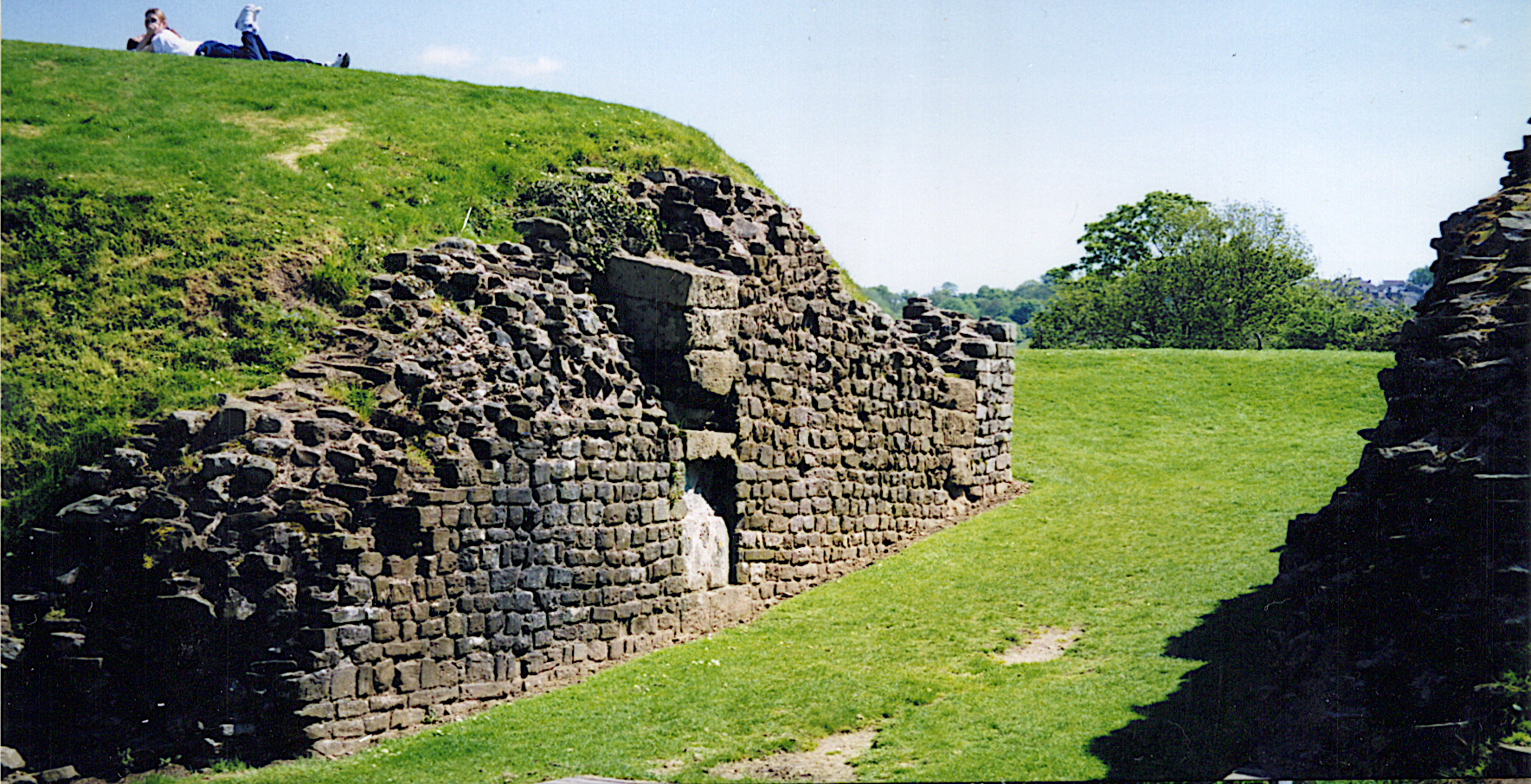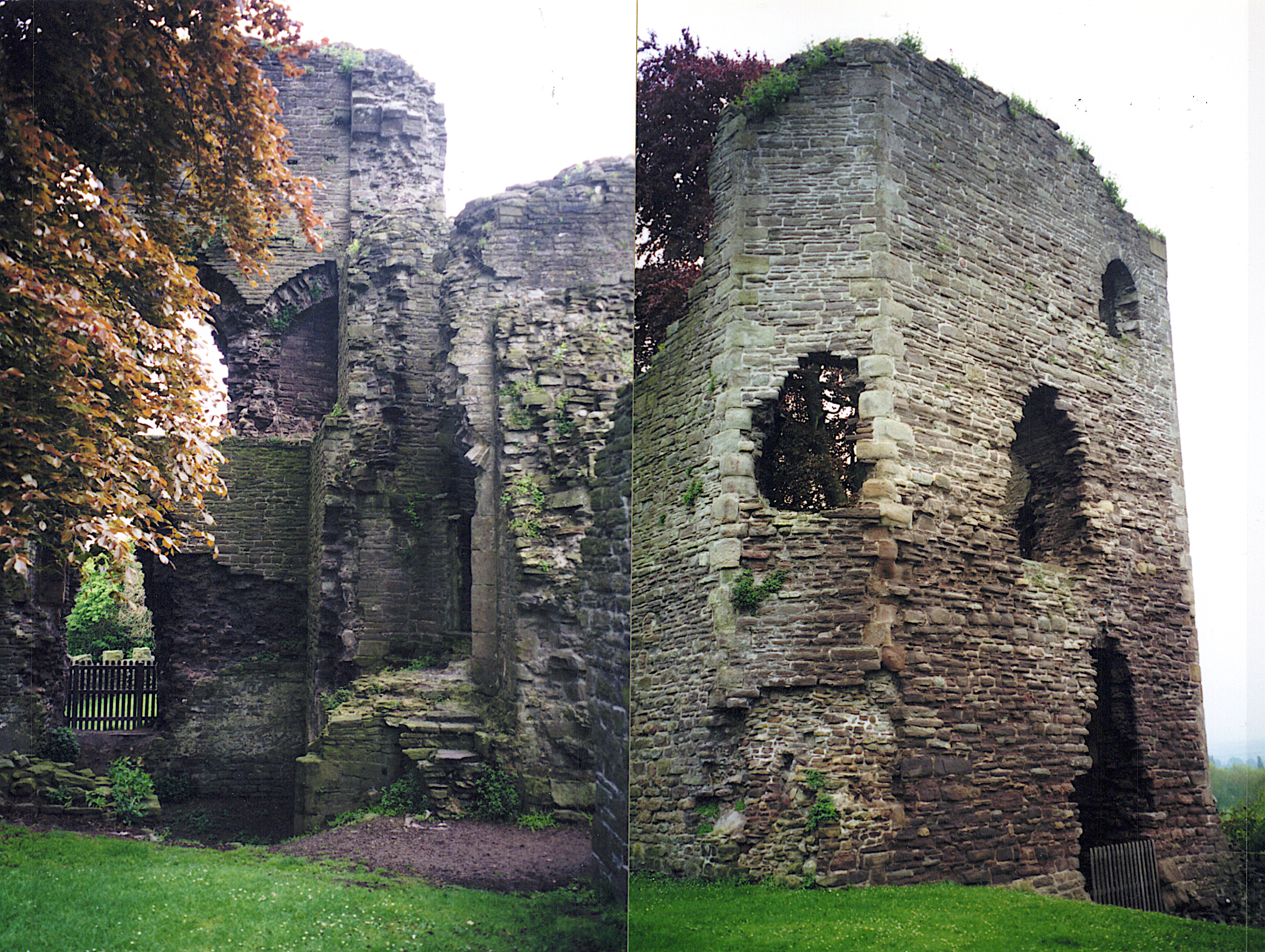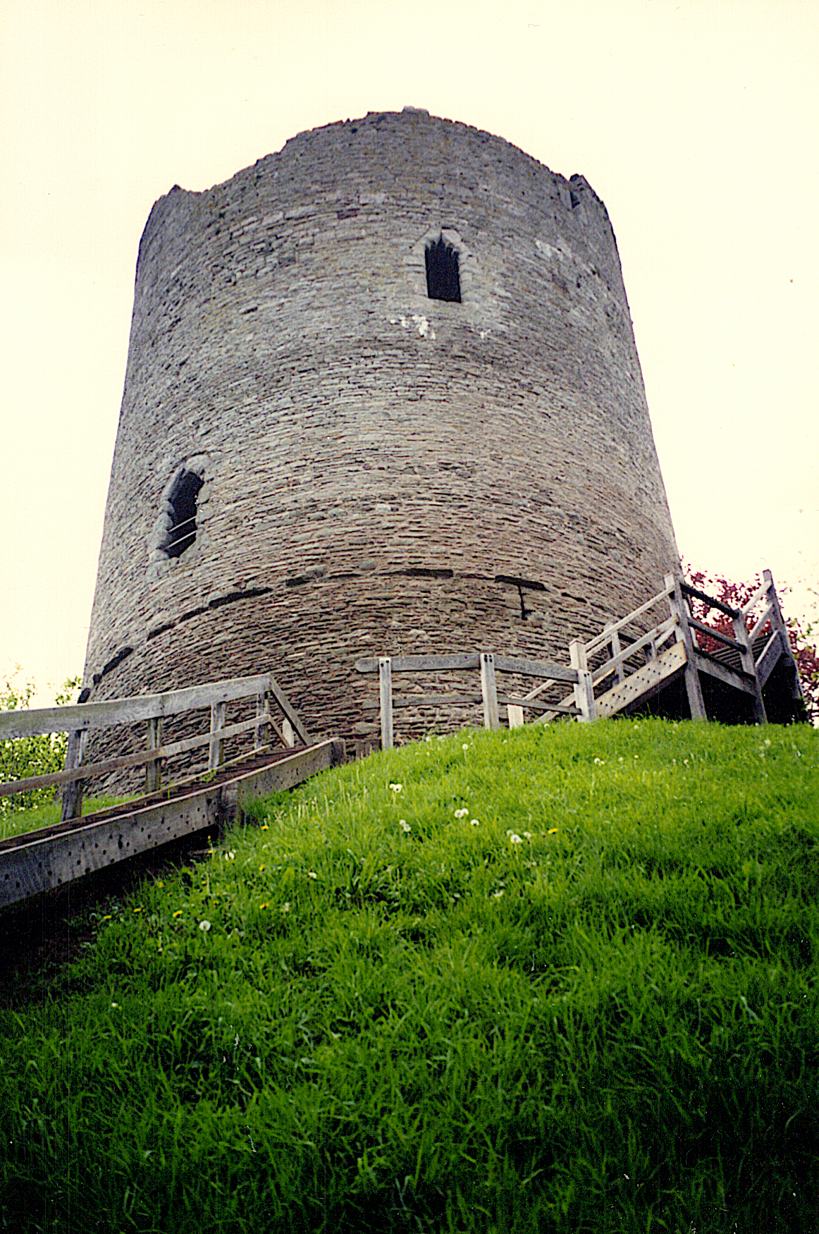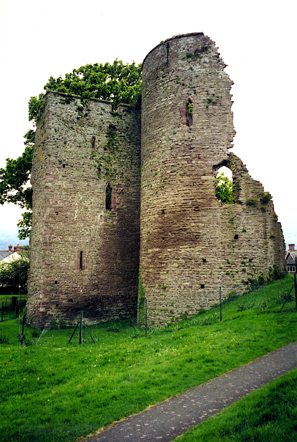 Originally a motte and bailey dating from ca. 1121. Refortified in stone and largely destroyed in 1403 by Owain Glyn Dwr. More here than meets the eye. Once a very large castle with a tall motte and wide bailey. There's a children's playground in the bailey.