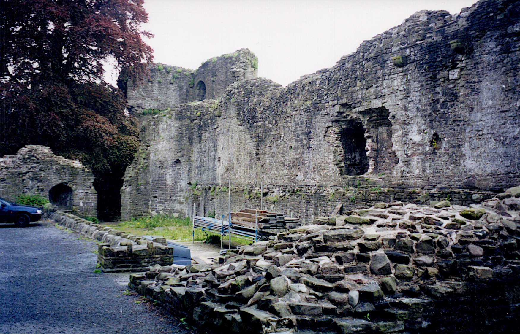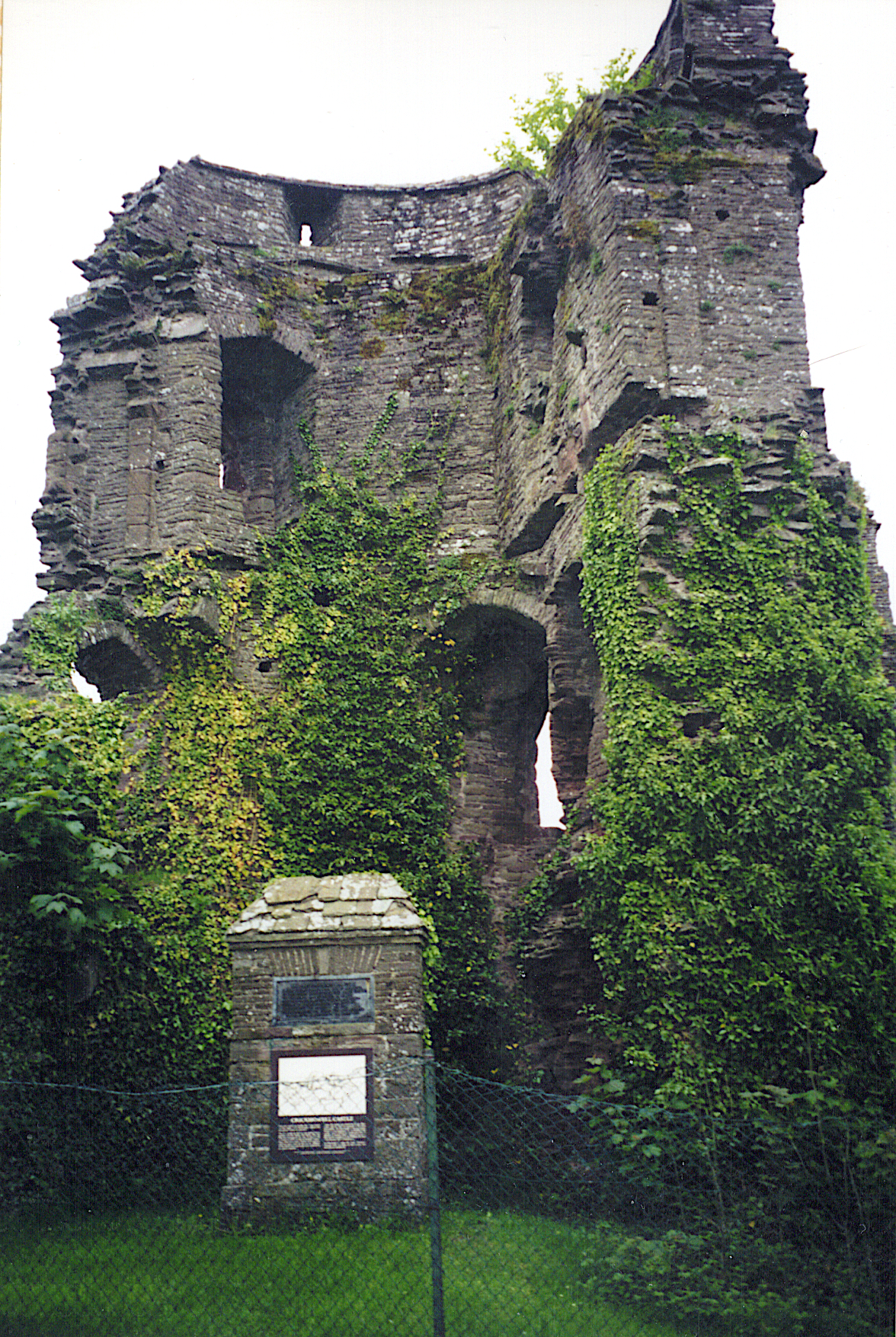 Original castle dates from c.1087. Site of a massacre of Welsh noblemen in 1175, carried out by the Norman William de Braose. A dark and gloomy castle that matches its history. Not substantial.