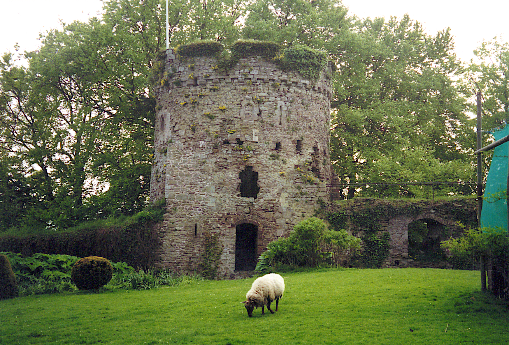 Motte and bailey castle south of Bronllys, in Powys. Large round tower on the motte dates from the mid-12th century. Not much to see here other than the tower, although the motte is impressive. A modern house occupies the bailey.
