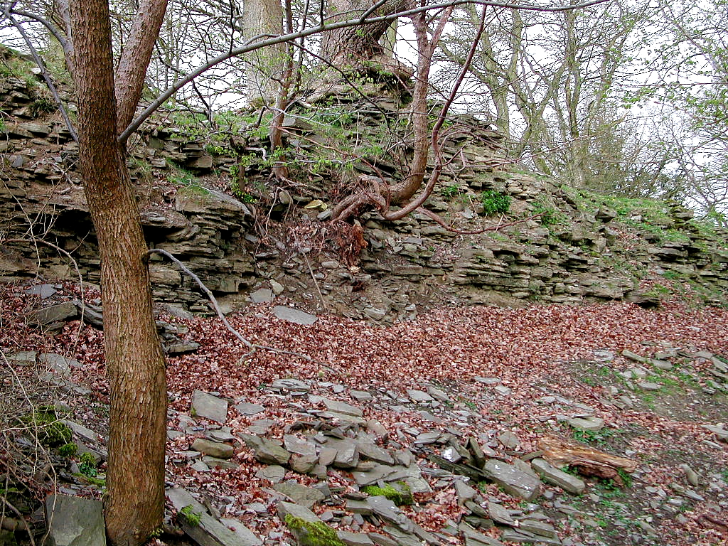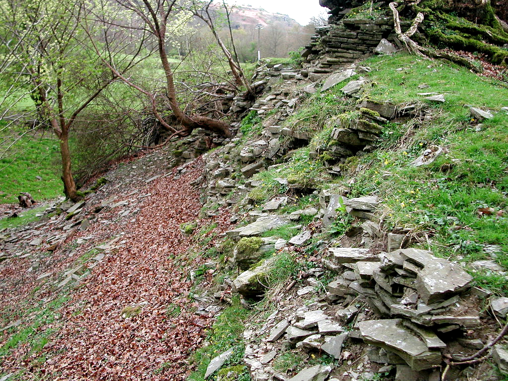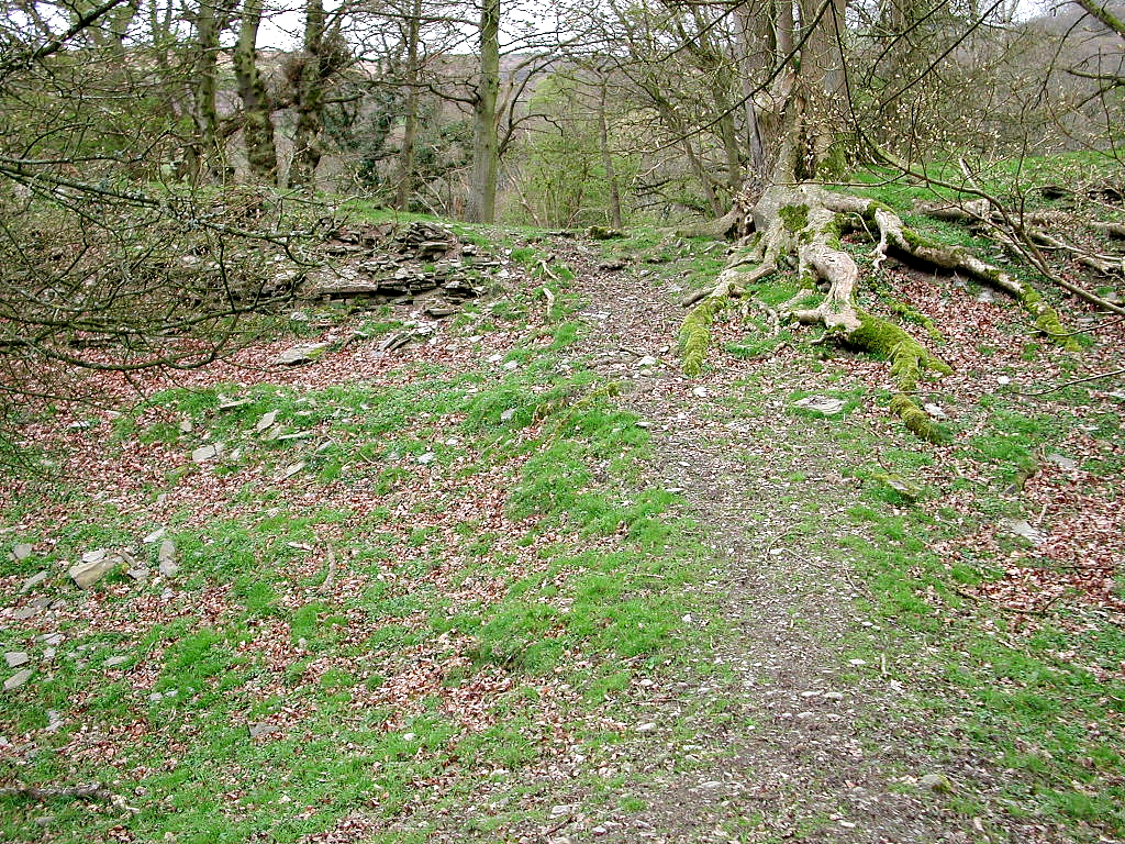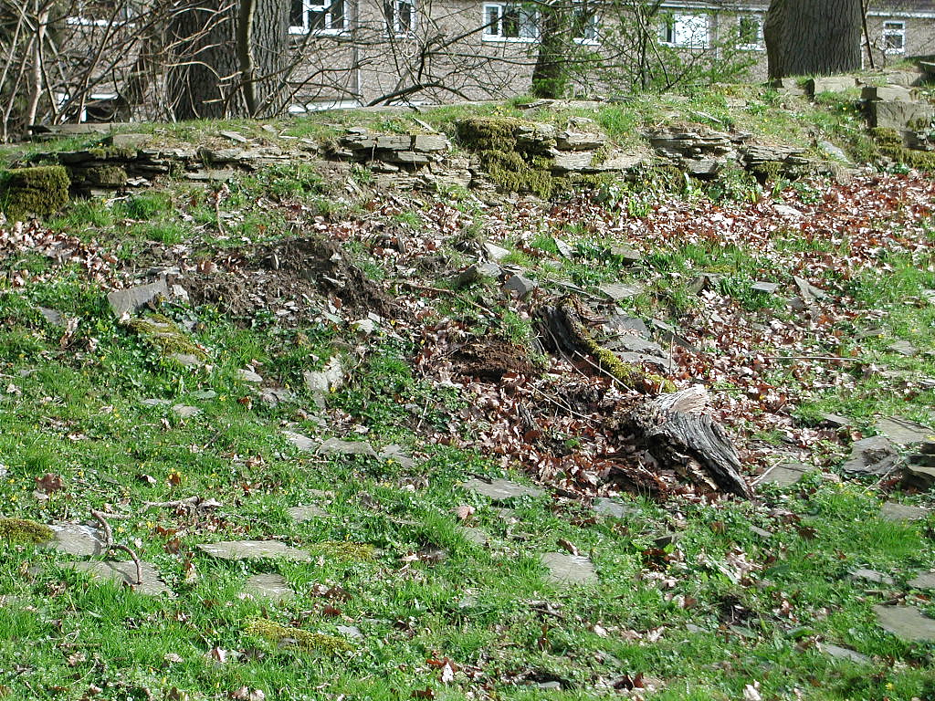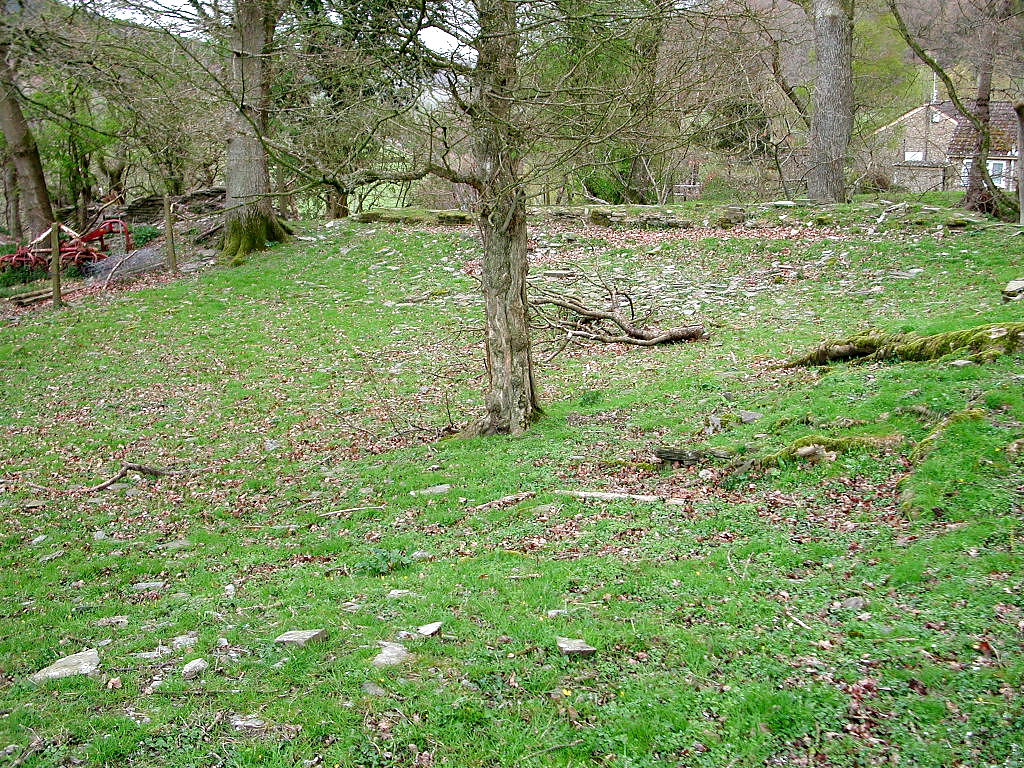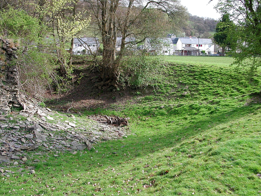 Below: view of the south east ditch at Aberedw II and the ruined tower (extreme left)