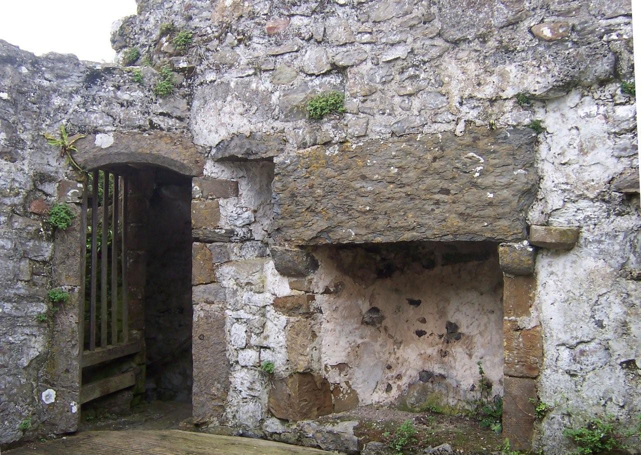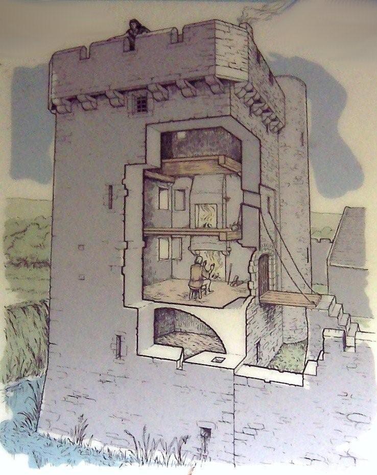 The battlements around the roof were supported on corbelling that ran around all sides of the tower, except where the spiral staircase protruded, to provide downward-facing slots that covered the base of the tower. There were a further two floors above the entrance room that were accessed using the spiral staircase built into one corner of the tower. The standard of accommodation in the castle was good for its day as each floor of the tower had its own fireplace and a gaurderobe, or indoor privy, was also provided.