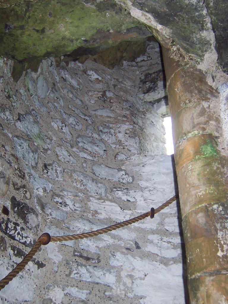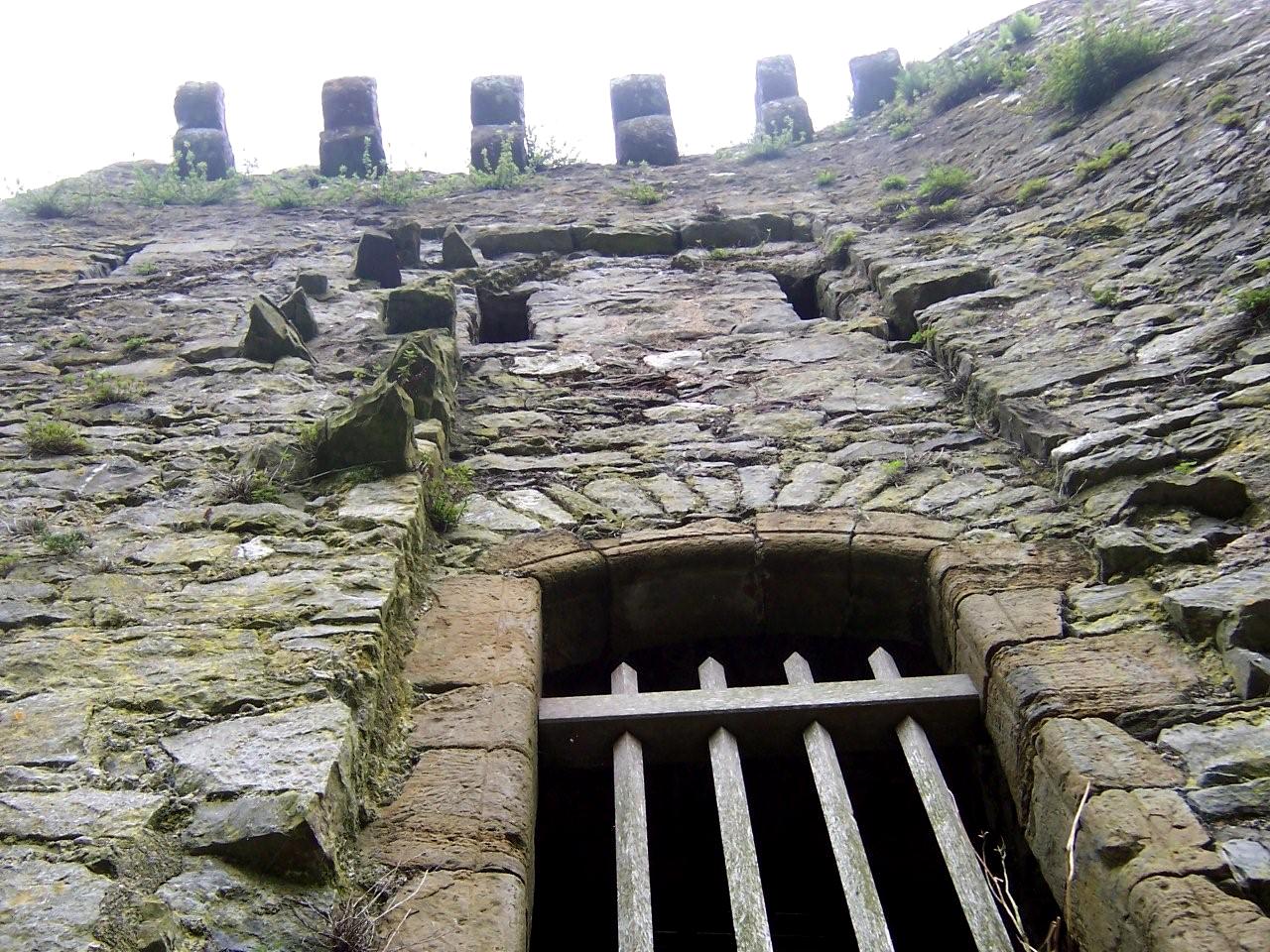 The base of the tower contained a storage room that could only be accessed from above until an exterior doorway was added for convenience in the 19th century. The basement had a fireproof stone ceiling so that the occupants of the tower couldn’t be burnt out from below if the wall had been breached. The tower was entered over a drawbridge at first-floor level, which could be raised to fit into a recess in front of the door. The apertures for the drawbridge mechanism can still be seen above the doorway (below). The entrance was further protected by an overhanging parapet at the top of the tower that allowed defensive fire to be directed at unwanted visitors from above.