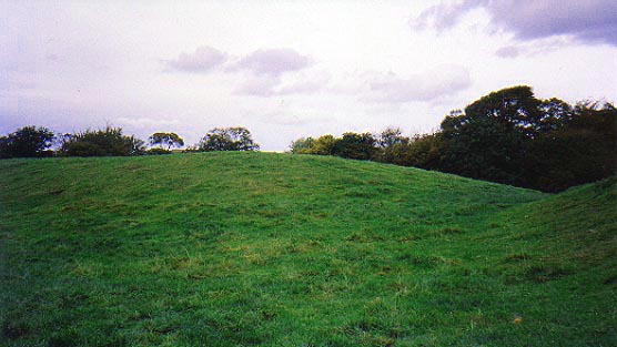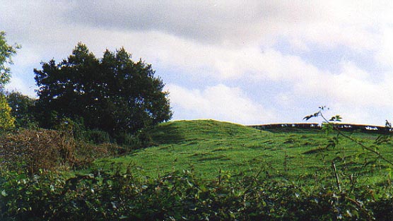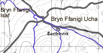 Above: The western end of the earthwork forms a low motte. There is a steep drop down to a road to the left with a gentler slope towards a stream to the right. Brynffanigl is situated in a fertile secluded valley a few miles south of the North Wales coast at Abergele. The small earthwork that still exists there appears to have been the site of a simple earthwork castle. The Clwyd Powys Archaeological Trust have carried out a field survey here and believe it was the home base of a medieval Welsh lord called Ednyfed Fychan. The local volume of the Royal Commission into Ancient Monuments in Wales states that Ednyfed styled himself "Lord of Brynffanigl".