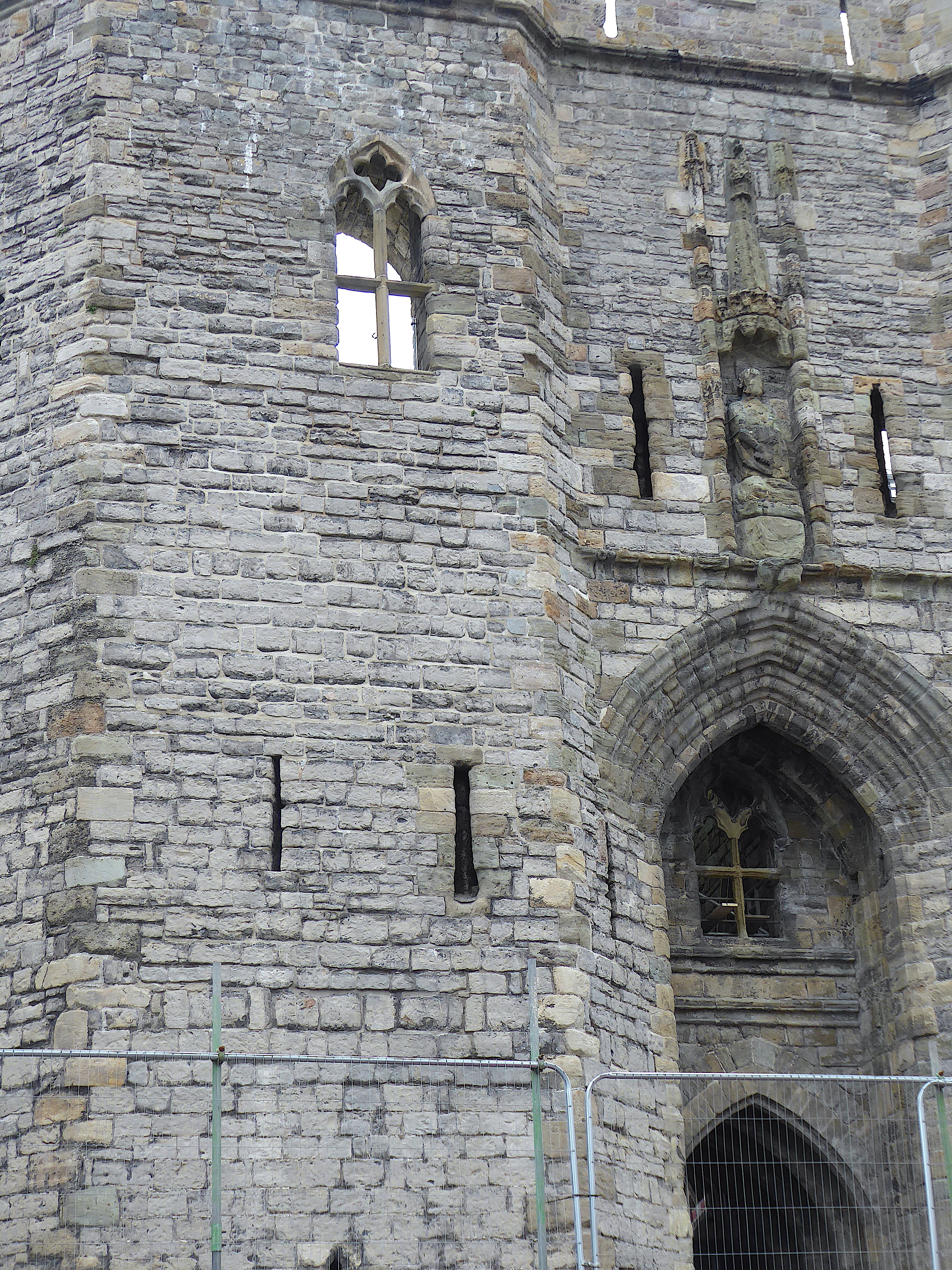 The King's Gate was never fully completed, but was immensely strong - it was twin towered, and had been intended to have a drawbridge, five doors, six portcullises, and a right angled turn (rendering attackers' shields useless as they turned the corner) from the main gatehouse into a smaller ward over a second drawbridge... and that doesn't even begin to consider the arrangement of murder holes, arrow loops and spy holes. The defences at the Queen's Gate were not as substantial as those at the other gateway; again, it was never fully completed. The gate was defended by twin towers, but could only be reached up the stone ramp from ground level to the summit of the earlier motte, on top of which the Queen's Gate was originally built. This made it far less vulnerable to attack, but even so, the gate was defended by two drawbridges and five murder holes. The final, and major, part of Caernarvon's defences were the town walls. This was an 800 yard circuit with eight towers and two twin towered gateways. The towers were situated 70 yards apart, the southern end of the circuit was blocked by the castle walls. The town walls were entirely surrounded by water filled moats, and the Rivers Cadnant and Seiont, and of course, the Menai Strait. The East Gate was the principal entrance - defended by a drawbridge, crenellated gateway, and two towers. The West Gate also had two towers, in addition to a barbican and portcullis; it faced out onto the Menai Strait.