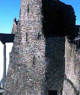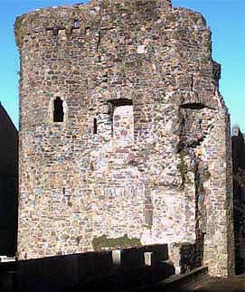 Left: The round tower has a spiral stairway that descends to its base and exits in a sally port or postern adjacent to the curtain wall. Three stories of accomodation were provided and the tower was well supported by spur buttresses to stop it being undermined and slipping down the bank. Right: The side view of the gatehouse reveals the remains of a spiral stairway and a doorway onto the vanished wallwalk. Below: Part of the truncated keep can be seen from the council car park inside the castle walls. The high curtain wall on the castle's most vunerable side can be seen to the right of the keep.