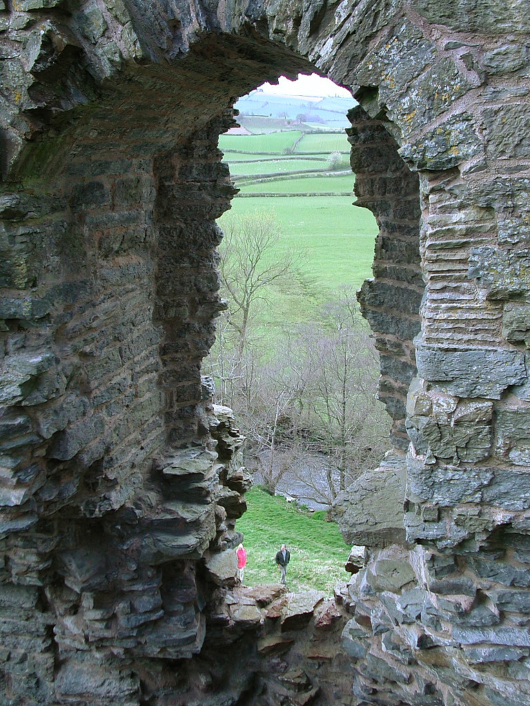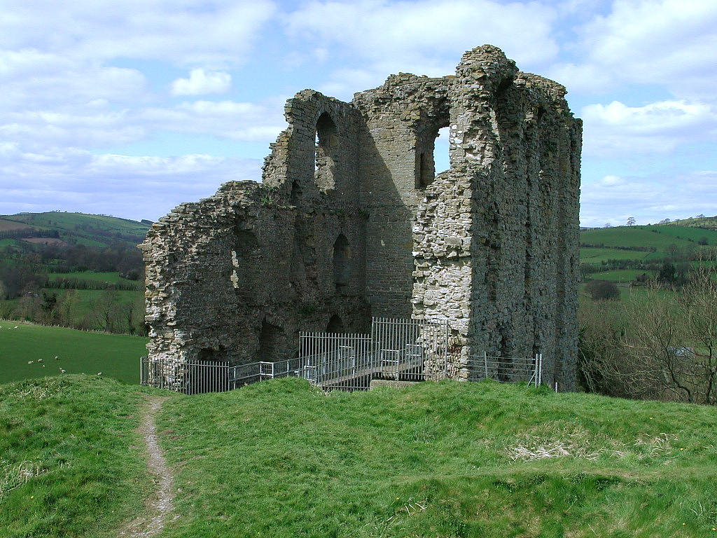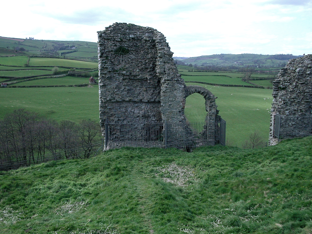 One of these lesser Marcher castles sits in the small village of Clun, located in Shropshire about 10 miles east of the Welsh border. It is about 15 miles south of the pretty Welsh border town of Montgomery, which has its own fine castle ruins. Today the village encroaches upon the castle grounds, and the castle itself is camouflaged behind more recent structures. However, the site itself, with its interesting rectangular keep and two baileys, is easy to spot and well worth the brief trek to reach the keep.