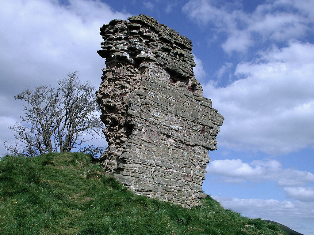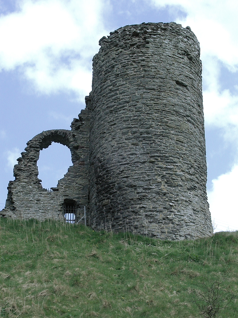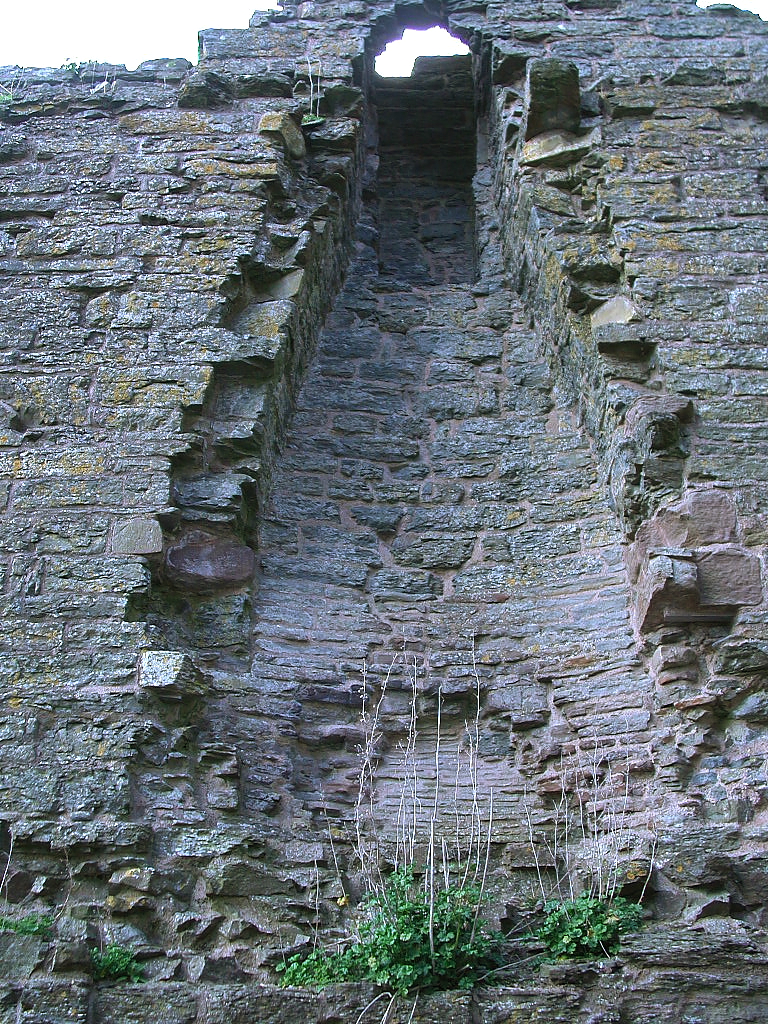 The only other masonry remains at Clun Castle are the remnants of the curtain wall which once enclosed the motte and keep. Built in the late 12th or early 13th century, the stone curtain would have replaced earlier timber palisades. Two round towers have survived from this wall and probably formed part of a fine gateway. Modern access has been limited to the keep because of the instability of its masonry, but the entire structure is visible from motte-level.