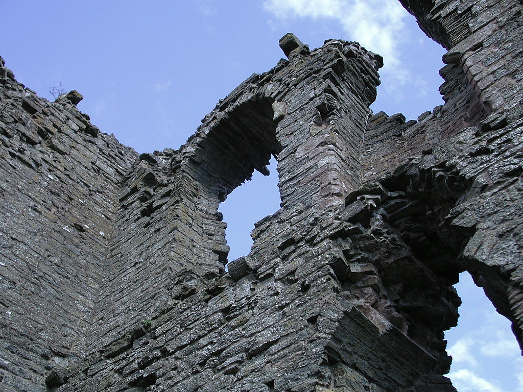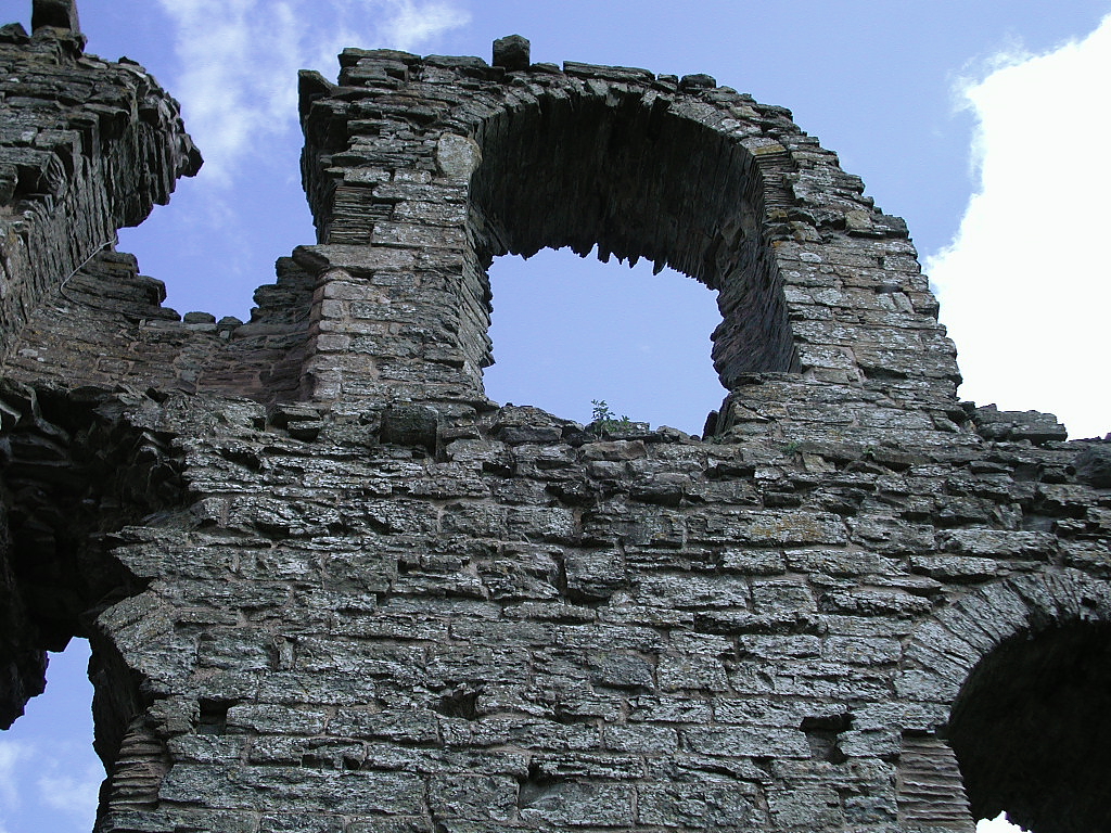 While the settlement at Clun never developed as planned, the castle was a formidable structure and today's visitor can certainly appreciate its original plan. Fronted by ditches and two heavily defended baileys (the massive earthworks best viewed from atop the motte), the motte and its keep offer an unusual spectacle. The greatly ruined keep is in itself a quite typical rectangular tower, but its placement on the steep-sided mound is distinctive. In essence, the 80-foot tall keep was embedded in one side of the motte, perhaps to prevent collapse; one wall rests in the ditch, its opposite sits atop the mound, and the other two climb the rocky slopes. The result is a four-storied keep, having two floors below the summit of the motte. The two others rise above the motte and are amply lit with arched Norman windows. The interior of the keep rests at a rather precariously-angled position, but must have been artificially levelled when originally constructed.
