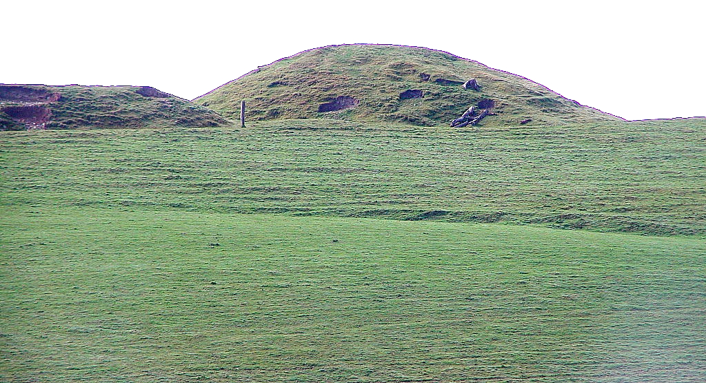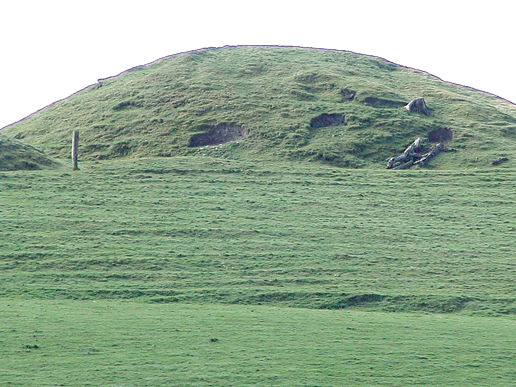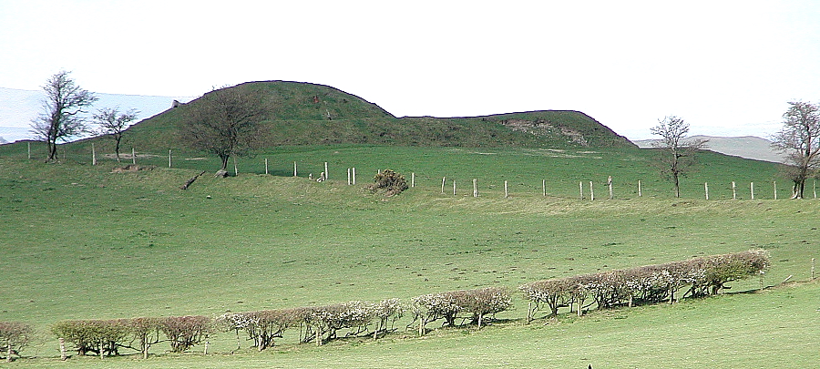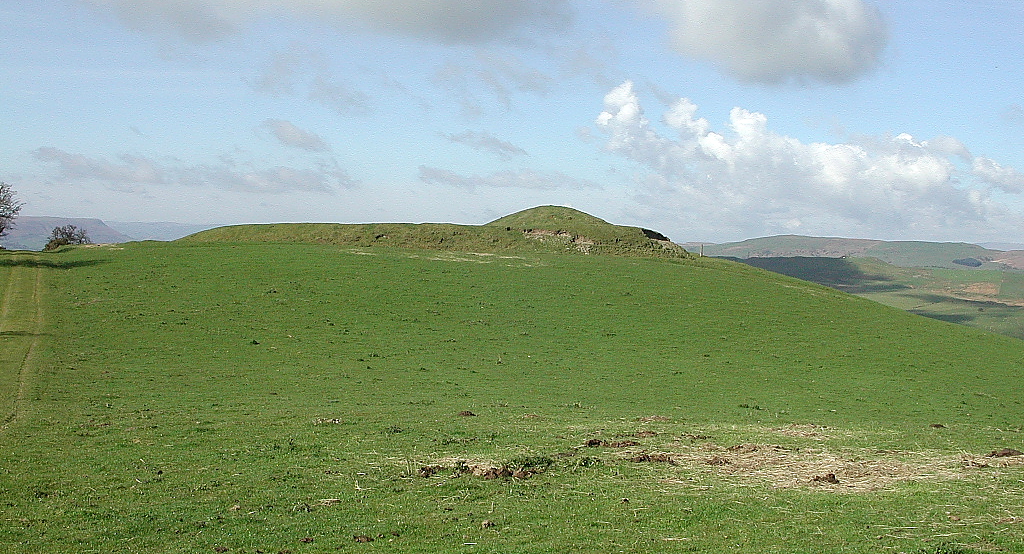 Crug Eryr is a minor motte and bailey castle built on a commanding hill in Radnorshire. Although still prominent on the landscape, the castle and surrounding earthworks appear to have been altered and damaged over the years, making it somewhat difficult to ascertain the site's original form. The castle's present form consists of a D-shaped bailey platform rising above a surrounding ditch, adjoining a motte that is protected by its own ditch. The ditch and rampart are noticeably stronger on the eastern side of the castle, and a causeway (entrance?) to the south crosses the ditch-work there. Paul Remfry notes the eastern rampart consists of shale fragments, which perhaps indicates the presence of a stone curtain wall. There is no direct evidence of an entrance to the castle other than the aforementioned causeway.