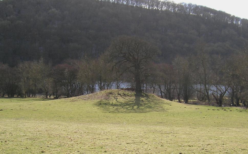 The remains of C11 or C12 motte at 'The Crugyn'. The mound has a base diameter of 42m north west to south east by 35m transversely. The motte is about 20m in diameter with a flat summit 7m by 5m in diameter. The mound is 3.5m high. There are no traces of a bailey. The mound is in the valley bottom and it appears to me to be heavily erroded (possibly the valley floods regularly). Much of the base diameter of the mound given is clearly erosion slippage and the mound would originally have been smaller in diameter but a taller and more steeply sided mound than it currently is. The mound is surrounded by a 20m band of firm but lush ground which may represent a silted up ditch. There is a badger sett in mound and the erosion is ongoing.