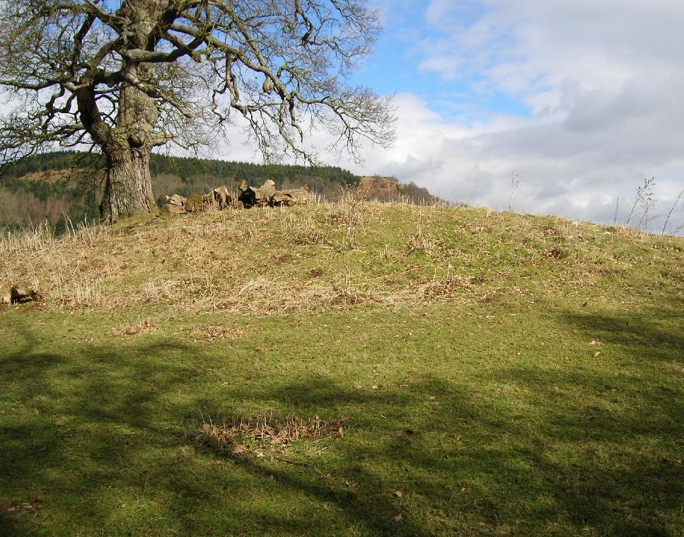Presumably this small motte was an outwork for Clun Castle. Whilst it would have been big enough for a small wooden tower I doubt it can have had much residential use. However, it can not have been a purely military structure since a small iron age hill fort is on a nearby hill and a reuse of this site would be the obvious military action. The motte is set in the plough land and presumably had some function in control and management of this land. I would expect that the local knight will have built the motte as a symbolic representation of his status and as a possible retreat but would have had his undefended hall nearby. This knight will have owed castle service to Clun Castle.