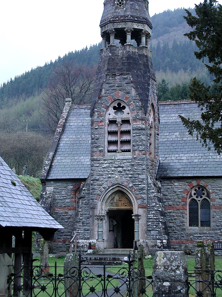 Abbey Cwmhir was fortunate in having a generous benefactor in the person of Miss Mary Beatrice Philips, a sister to the Squire George Henry Philips, for during the years 1856/6 a new church was built entirely at her expense. The style of the present church is 12th century Gothic, and comprises a chancel with an apsidal east end, an organ chamber on the north side of the chancel, a tower and spire on the south side of the nave with ground stage as the south porch and a vestry attached to the north west corner of the nave.