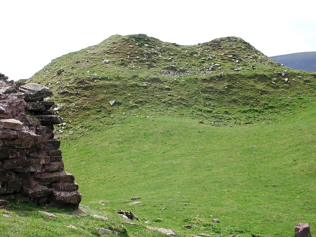 The site of Dinas keep is today marked by the huge pile of grass grown rubble which overlies the masonry remains of this once proud structure. The mound of debris is about 5 metres high and seems to indicate a masonry hall keep about 22 metres by 14 metres externally. Until recently the wall of this tower, uncovered by an unofficial excavation made before 1950, protruded through the rubble at the south west corner. Surrounding the ruin of this great tower was a further wall, or chemise which was about 34 by 26 metres. Again the tentative excavations of many years ago had uncovered the face of this wall. Unfortunately there is no reliable evidence as to the thickness of the keep walls, but these must have been 2 metres thick or more if the structure was over 2 storeys high. The photograph shows the ruins of the keep from the north.