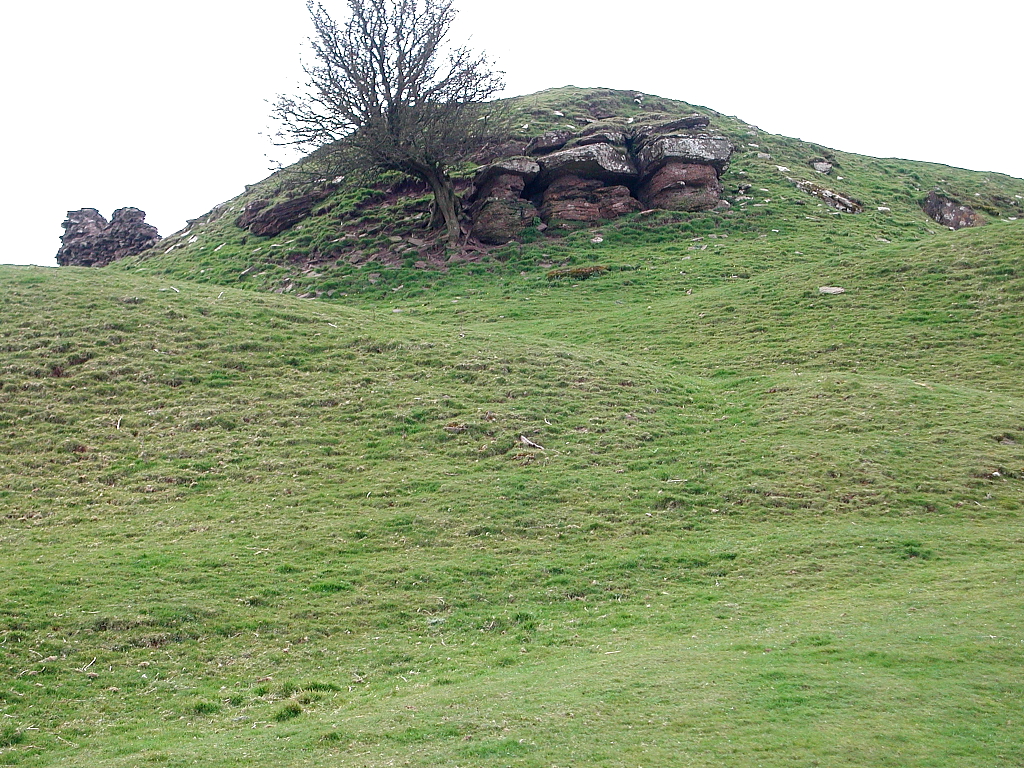 The remaining standing ruins of the castle, the northern gatetower, probably dates to after October 1233 when the castle was sacked, but soon re-garrisoned. It also seems likely that the great unfinished rock-cut ditch on the west side of the castle was made at this time. A similar great ditch was probably begun and never finished at New Radnor Castle, again during this period of emergency. After this flare up of activity the castle would seem to have succumbed to Prince Llywelyn in the winter of 1262-63 when Brecknock was invaded and largely annexed by the Prince. Presumably it was recovered and refortified in the period 1266 to 1274 and most likely earlier rather than later. Leland describes the castle as "a goode mile from Blaen Leveni (Blaenllyfni) upon the toppe of a notable hille, it is now ruinous almost to the hard ground, there be manifest tokens of three wardes, waulled about..." He goes on to say that the castle was destroyed by the local inhabitants of these parts during the reign of Henry IV. Destruction of this Duchy of Lancaster castle by local adherents of Owain Glyndwr seems most likely. In 1741 Buck included a long distance representation of the castle in his view of Bronllys. This shows that the castle has not changed its appearance much in the past 250 years!