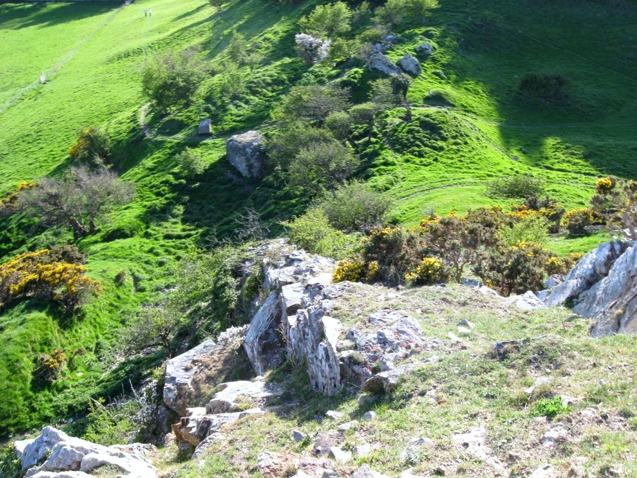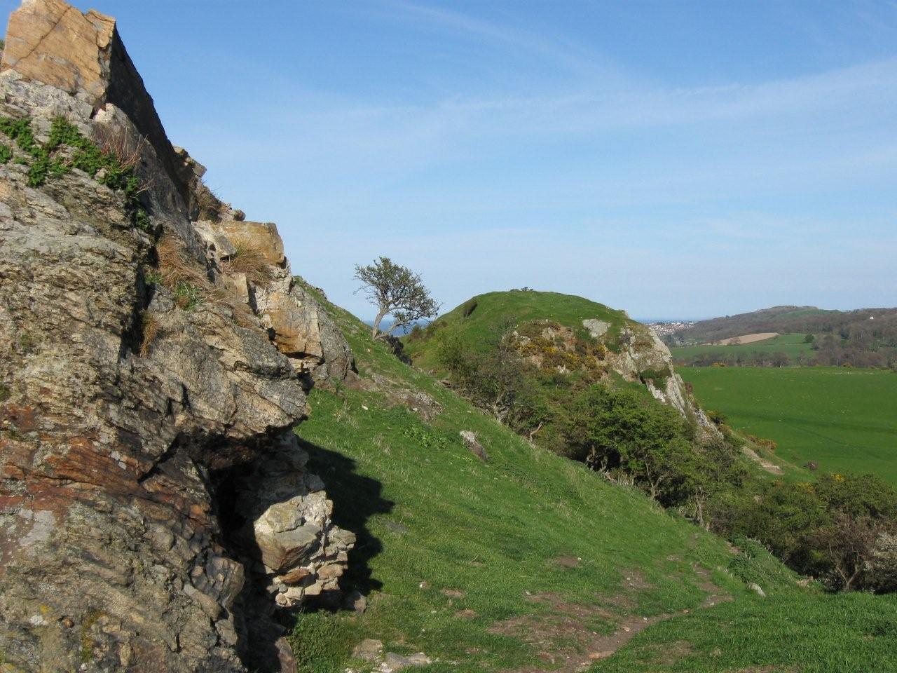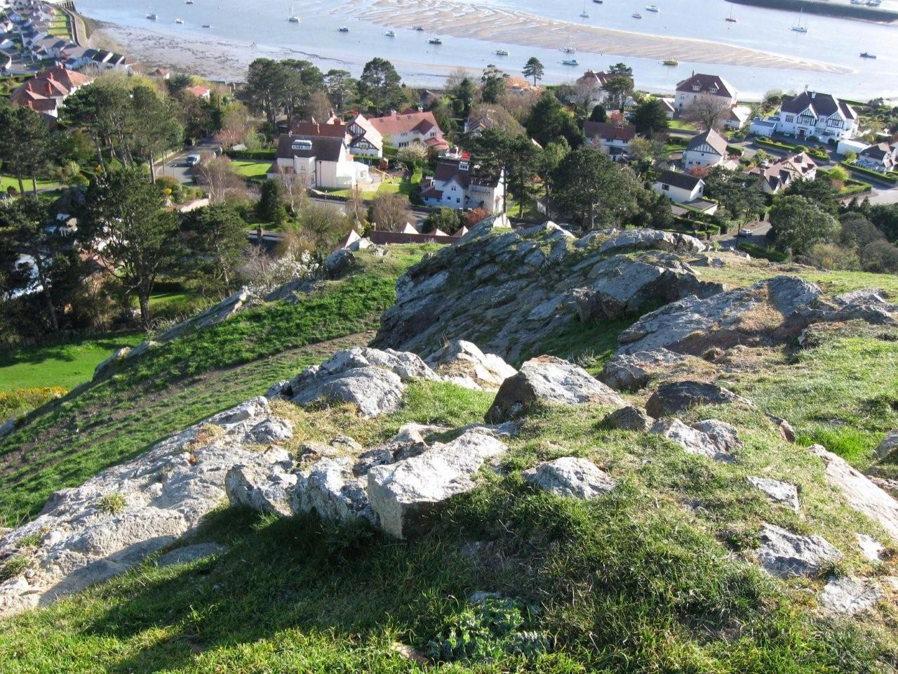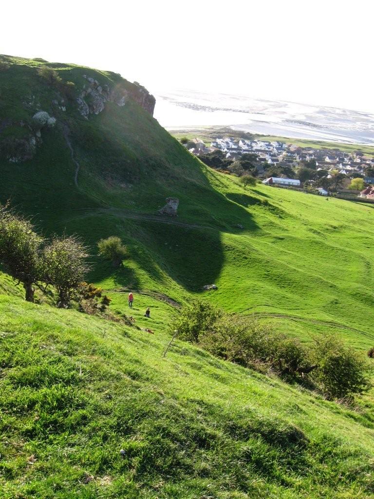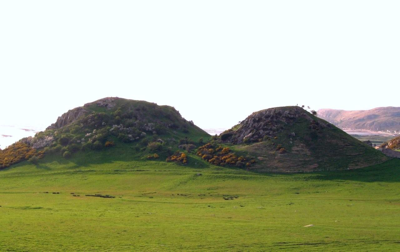 The twin hills of Deganwy Castle looking from the south. The earthern ramp to the outer gate can be seen between the hills.