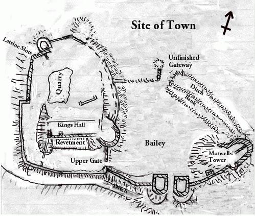Things not so obvious in the sketch are the double upper gateway with enclosed killing zone as at Dinefwr, and the small tower on the far side of the hill with attached small hall and latrine chutes.