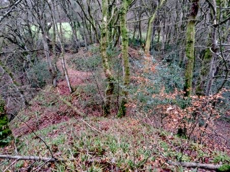 The castle is on a promontory, or spur of land between the Arth and its tributary, the Nant Erthig. There could well have been a prehistoric defence structure here that was adapted in mediaeval times. There is a strong ditch and linear ridge defence on the eastern side, whilst all other sides fall into steep ravines. There seem to be three separate mounds within the site which covers about 3 ha. The entire area is covered with ancient oak and beech woodland with a very diverse ground flora.