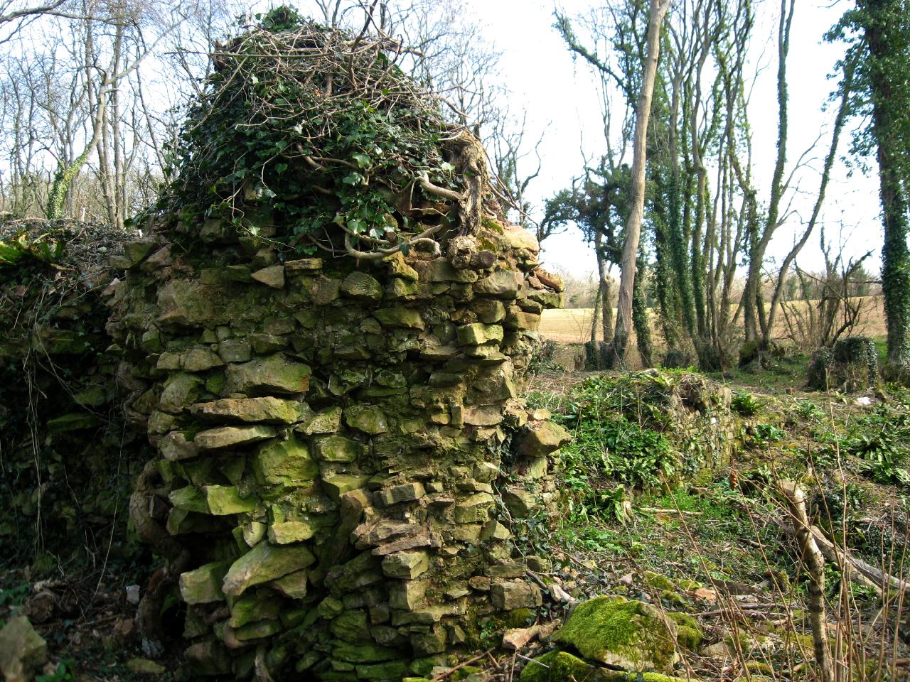 In the midst of a thick copse wood on the top of a hill that rises just above the farm buildings, and near a road which leads through a wooded dingle to Wentwood, are the foundations of a castle which once existed here-these remains however, the inhabitants of the place have always been used to call " the old Chapel," and the wood goes by the name of the Church wood. The underwood having been recently cut away, it was not difficult to trace by the heaps of stones the lines of the walls of the old castle, which inclosed a considerable area, and a ground plan of so much of the foundations of these buildings as can be traced, (for little else remains), is given in Plate X. The approach and entrance seem to have been from the road above mentioned, and these remains are situated on the top of the steep bank or hill on the right as we enter the mouth of the dingle, overhanging the road, which the castle would command, as well as the more open country which lies below it in the direction of Caerwent.