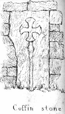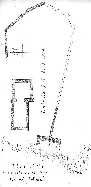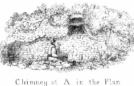 On the top of the hill are clearly to be seen the foundation walls of a building which consisted of two compartments, as shown in the plan in Plate X. This building stands alone, and its position is due east and west, and our first impression was that it was the remains of a Church, the smaller compartment towards the east being the chancel, though it is wider and not built in a line with what would have been the nave. The walls of this part, though nearly level with the ground are quite sufficient to show there was an entrance on the south side, answering to the usual Priest's door. The walls of what would have been the nave are a few feet above the ground but we cannot say with certainty whether there was any other entrance doorway or not. The external projections of the cross-wall where the two compartments open into one another, look as if they were the foundations of buttresses, which tends to bear out the idea of its having been a Church; but there are no wrought stones anywhere visible to give any further indications of what it may have been. The total internal length of the building seems to have been about 50 feet. On the brow of the hill, connected with the extremity of what seems to have been the boundary-wall, is a portion of the wall of another apartment, somewhere about 20 feet wide; the outer side of the walls have been entirely destroyed, but in the thickness of the inner wall at the point of junction with the boundary wall, is a flue, apparently a portion of a chimney; this is marked A on the plan, and a view of this chamber and its chimney are also given in Plate X. The masonry of these walls is very rough work, and the courses of stones are very irregularly laid; below there is a large piece of wall, thrown down and tilted up on end, having the roots of a large old yew tree twined round it; this will shew that it has. been for centuries in that position.