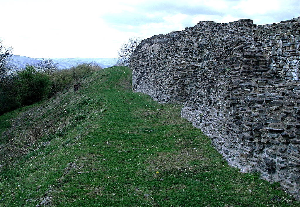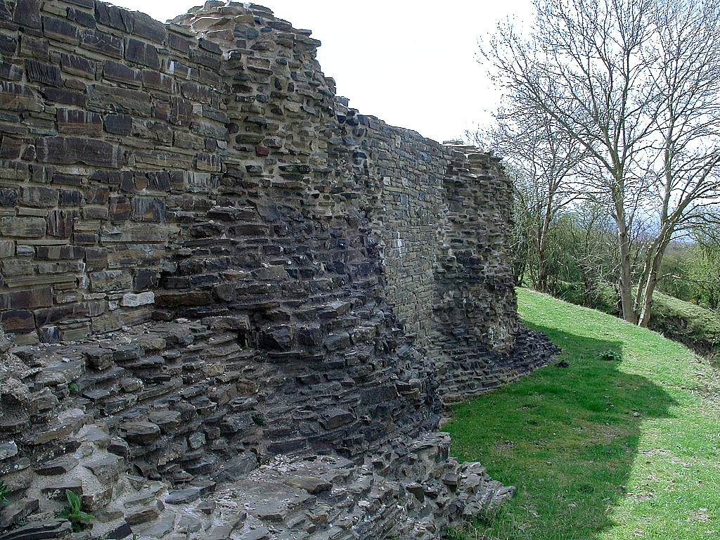 Below: exterior view of the southwest curtain wall at Dolforwyn Castle.