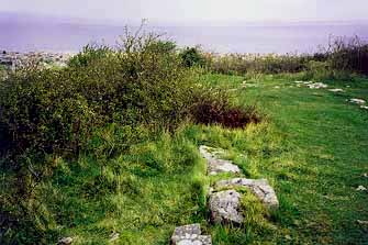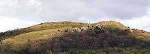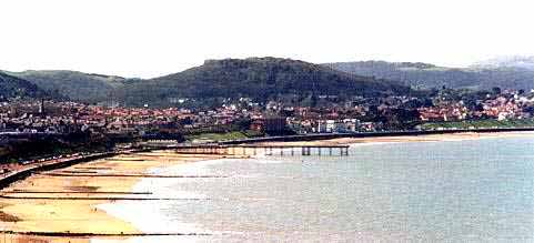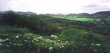 | Below: The hillfort bank on top of hill is obscured by vegetation. In the centre background can be seen Maelgwn's fortress of Deganwy, visible as a small but prominent hill. A tract of marshy ground separated the two rival strongholds. |