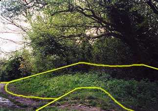 Could this rudimentary stone fortress have been in use during Ednyfed's time? Giraldus Cambrensis wrote that in 1188 a similar site had been built by the sons of Owain Gwynedd at Carn Fadryn on the Lleyn Peninsular. However, such remote sites were no doubt impractical and by the 1200's castles tended to be more conveniently situated. There was no sign of mortared stonework or a 'proper' earthwork castle on the hilltop and so it could probably be ruled out as the site of Ednyfed’s castle. Was This the Castle? Having failed to find any traces of the castle we returned down the hill the way we had come and passed Llys Euryn again. Then I noticed a curving filled-in ditch with the slight remains of a bank next to it. The bank ran into the trees where a cone shaped mound of rising ground was apparent. This may have been the castle motte and the curved bank could have been the defensive rampart of the outer court or bailey. The limestone quarry had destroyed the rear two-thirds of the mound, which would explain the previous lack of identification. We couldn’t explore the supposed bailey area very much due to the impenetrable blackthorn undergrowth, however the far edge of bailey had a definite drop, down which the path zig-zagged. Below right: The presumed site of Ednyfed's Castle with the earthworks picked out in yellow. The edge of the sloping earthen mound, which may have carried a defensive wooden tower, can be seen rising into the trees. Its rearward part had been removed during extensive limestone quarrying. The eroded remains of a ditched rampart leading away from the motte can be seen at the bottom of the picture. It was probably leveled when the fortified mansion was built nearby. |