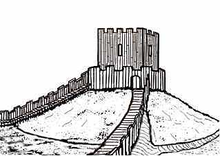 Above left: How a motte and bailey castle could have appeared at this site. Protective ditches would have surrounded the earthen ramparts and stout timbers provided a secure enclosure.