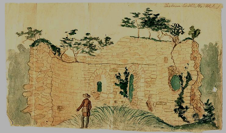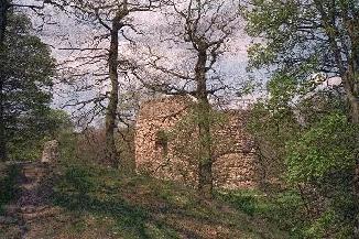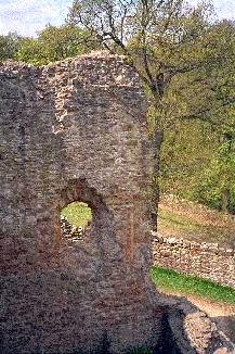 The castle is built of pale brown and gray sandstone held together with various batches of mortar, each with a different, pebbly texture; in several places the mortar has out-lasted the stones it was meant to hold. Some walls are smooth and straight-formed, while others are crude, like piles ofrubble. It appears that some parts of the walls were built from stones taken from the ruins of other parts. The whole structure sits on a verywell-built, tapered foundation. I can see below me a portion of wall displaying an eight-foot section of beautifully made quoins of uniform brown stone. Graffiti and litter do not detract from the peaceful effect of the place. Patches of lichen on the walls give it an ancient feeling. The three-foot-thick oak trees standing about must have been seedlings long after the castle was in ruins. One of them has grown in the courtyard and now stands taller than the uppermost part of the castle above me."