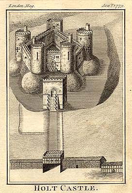 Circa 1735 - Samuel and Nathanial Buck made an engraving of Holt castle, which showed that it had not been completely demolished as the remains of a round tower and the rectangular annex could still be seen. Other stumps of masonry, some of which are still visible today, can be seen protruding from a deep covering of accumulated earth.