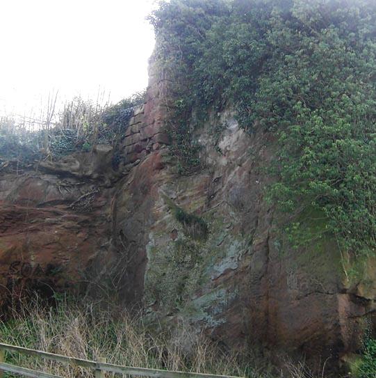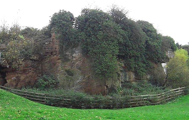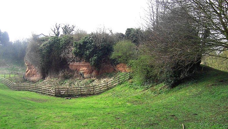 This picture shows the east side of the castle, now much reduced by quarrying. The earthen bank to the right of the photograph leads to the site of the barbican tower that stood in front of the main entrance. Beyond that, the position of two of the four demolished round towers can be seen at the corners of the elevated enclosure where the red sandstone rock faces can be seen. The remains of the wet moat lie around the enclosure in front of the wooden fence.