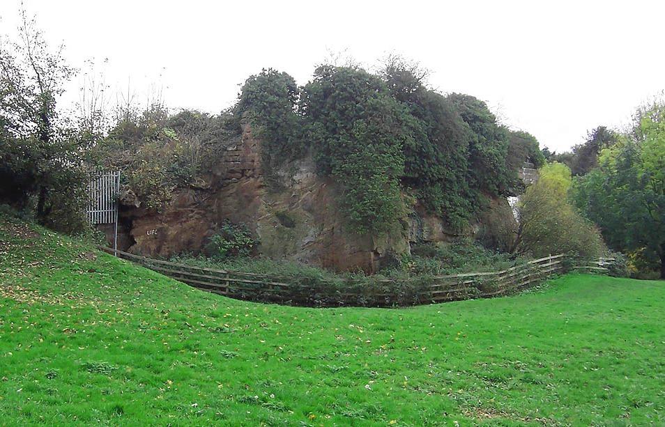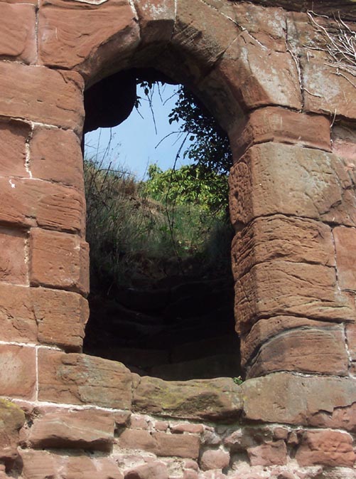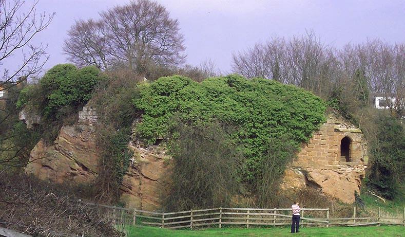 Today - All the towers have now gone, leaving the remains of a thin wall around the top of the rock which includes part of the main gate and the postern gate with internal steps. Many finely cut sandstone blocks can be seen in the walls of Holt village and these presumably came from the castle.