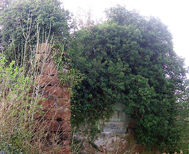 The remains of the buttress and curtain wall to the right of the gate passage can be seen through the undergrowth that covers the entrance ramp. There is nothing of note to be seen inside the enclosure and access is not permitted for reasons of public safety.