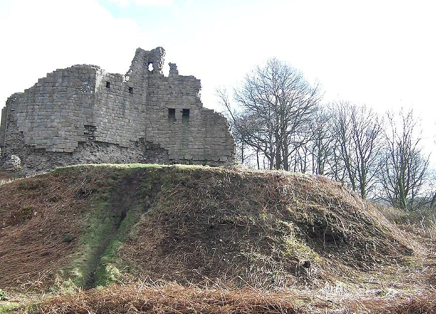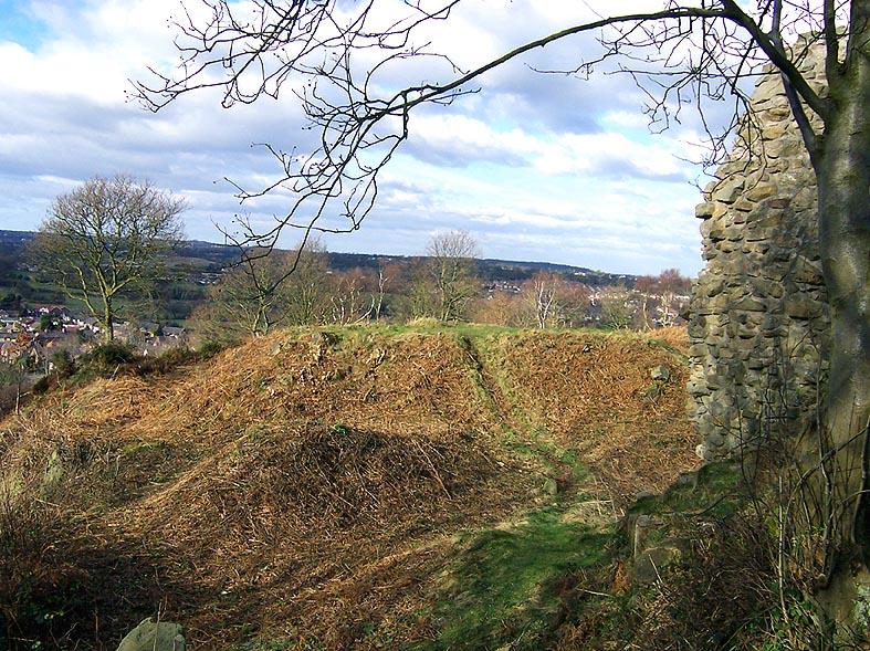 "The mound that supported the bridge can be seen in the moat to the north of the main gate. The curving outer bank of the iron-age hillfort is to the left of the outer castle bank."