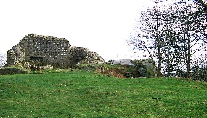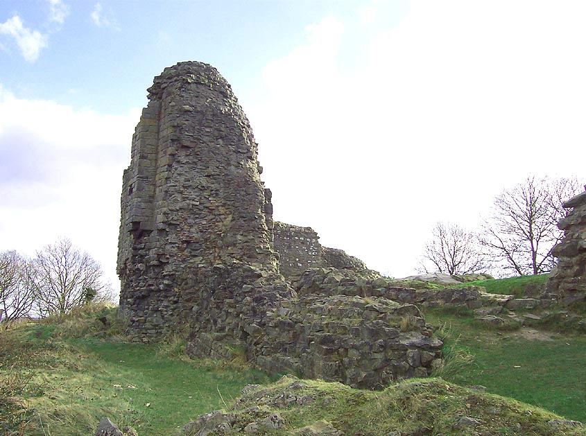 The masonry castle, on the highest point of the hill, was probably first built by Dafydd ap Gruffydd, in lands given him by Edward I after the first Welsh campaign of 1277, in recognition of his help in their capture from his brother Llywelyn. Its architecture reflects Dafydd's divided loyalties, with English elements incorporated into a basically Welsh pattern. A single curtain wall, which survives on the east, is fronted by a substantial ditch with an outer counterscarp bank; there are towers, with blunt apses of English pattern, on the north and south-east and a round keep at the south. Openings for latrines at first floor level can been seen in the curtain to the west of the north tower, and unusually, two large holes in the west wall of the tower itself contained timber beams supporting the canopy of an internal fireplace. The south-east tower, again unusually, apparently had a living chamber at ground level, and its poor defensive position offers inadequate cover to the eastern curtain. There is no evidence of defences of the precipitous west, although this side has probably been damaged by quarrying. It is uncertain where the entrance lay, although one on the north-west seems likely.