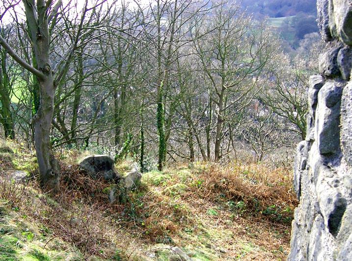 Note: Mr. Northall believes that the castle's main gate was likely located at the northwest corner of the castle. He makes the following statements and presents the following two photographs below as evidence. "Looking west from the broken end of the northern enclosure wall at the probable site of the main gate. The protection afforded by the steep western slope of the hill is obvious."