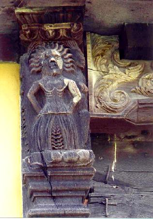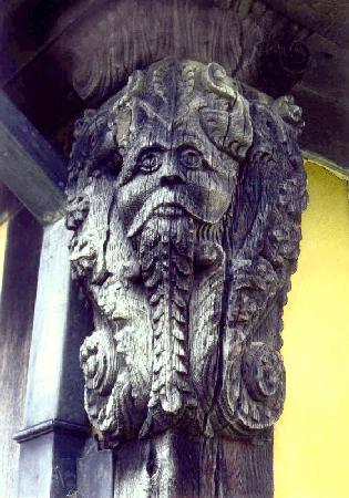 wooden carvings found on the later gatehouse at Stokesay Castle.![]()