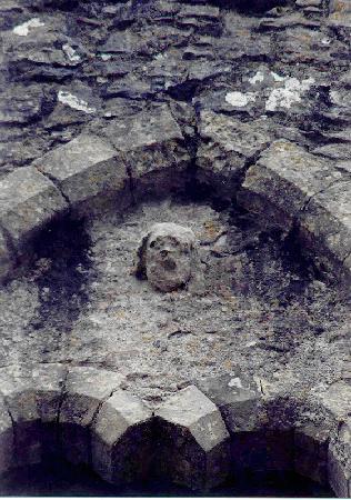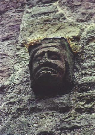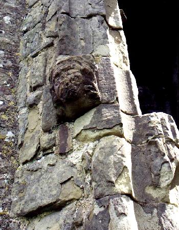 A carved head over the third floor window of the keep at Pembroke Castle (left)