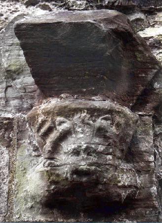 a corbel supposedly depicting a queen on the south range porch doorway (left)