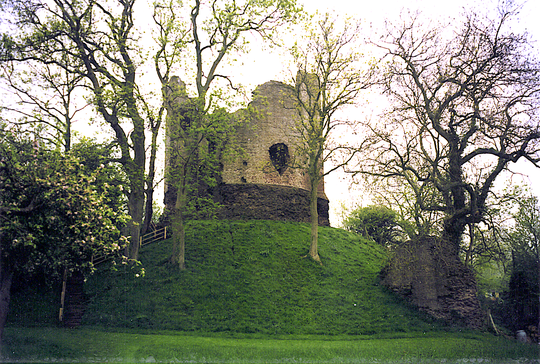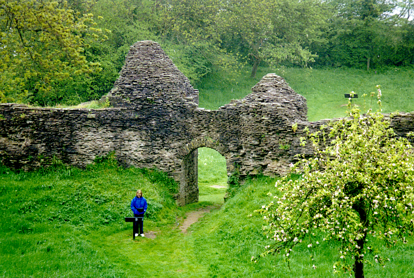 Nestled close to the foreboding Black Mountains, along the backroads of Herefordshire, Longtown Castle has survived the centuries with dignity. However, your initial view of the castle may be confusing, as well as intriguing. The minor road into the tiny medieval town actually cuts through the outer baileys of the site, a surprising effect when you realize you have just driven through the castle grounds! Slightly camouflaged behind a line of trees, the motte suddenly springs into view, looming high above your head. It is an exhilarating but equally threatening vision, one that certainly must have intimidated anyone contemplating an assault in the Middle Ages.