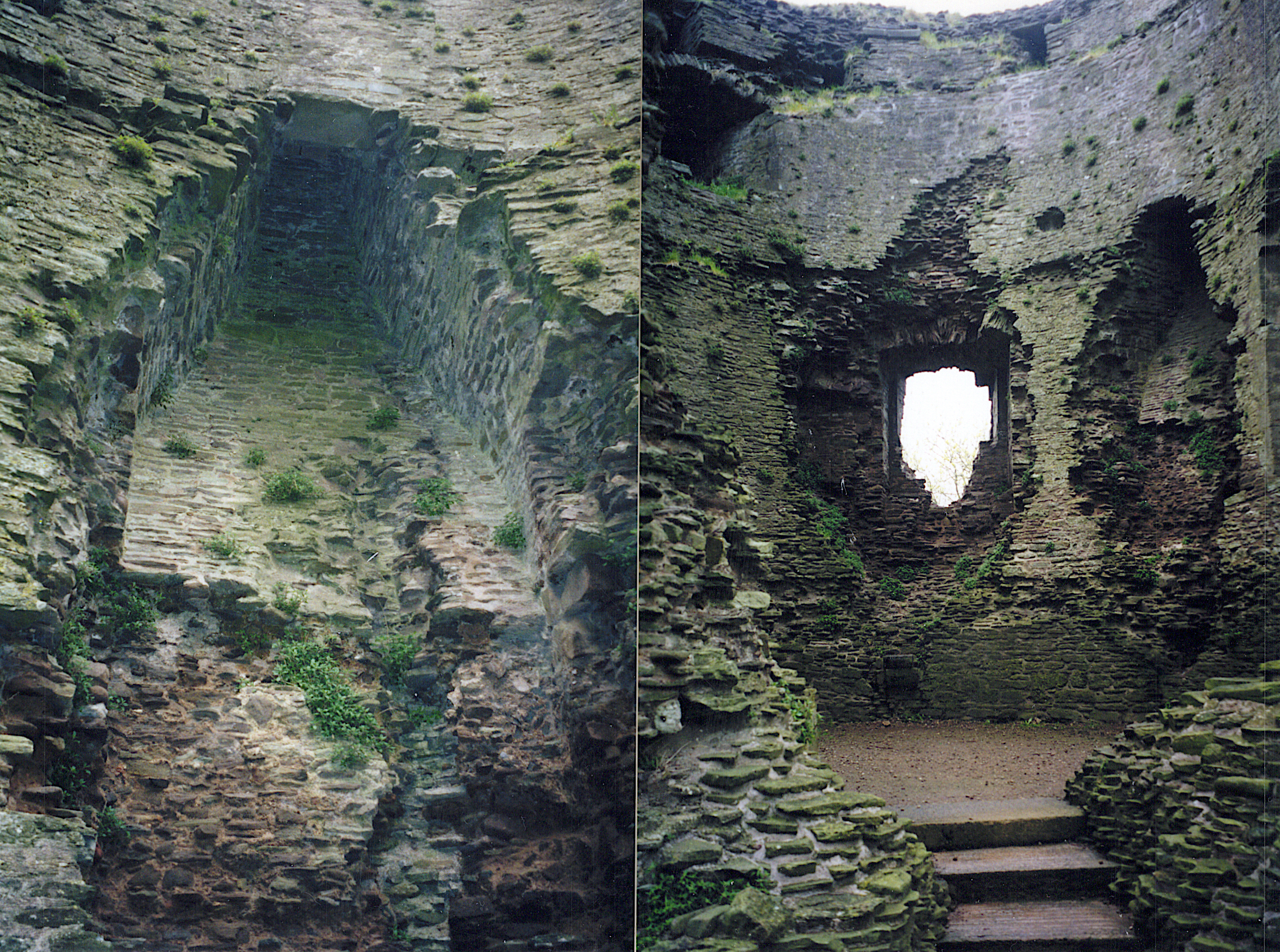 The enormous earthen motte is an impressive structure, rising some 35 feet into the air. Originally crowned by a timber tower, the massive mound most likely received its splendid round keep in the 13th century, when another Walter de Lacy had possession of the castle. Although unusual for England, round keeps were relatively popular in Wales, so it is not too surprising to find one here along the borders, even though Longtown is considered an English castle. (Welsh round keeps may be explored at Skenfrith, which is about 12 miles SE of Longtown; at Tretower, about the same distance to the SW; and at Bronllys, about 15 miles north of Tretower.)