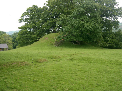 A royal seat - the original capital of the Princes of Powys. The site may have shifted from an earlier one on a hill top 1km away; the motte was probably built either by Owain Cyfeiliog (c1170) or by Robert de Vieuxpoint (c1210). The seat of Powys was transferred to Welshpool in the early c13th, and Llywelyn ab Iorwerth destroyed Mathrafal in 1212. Traces of wall still remain.