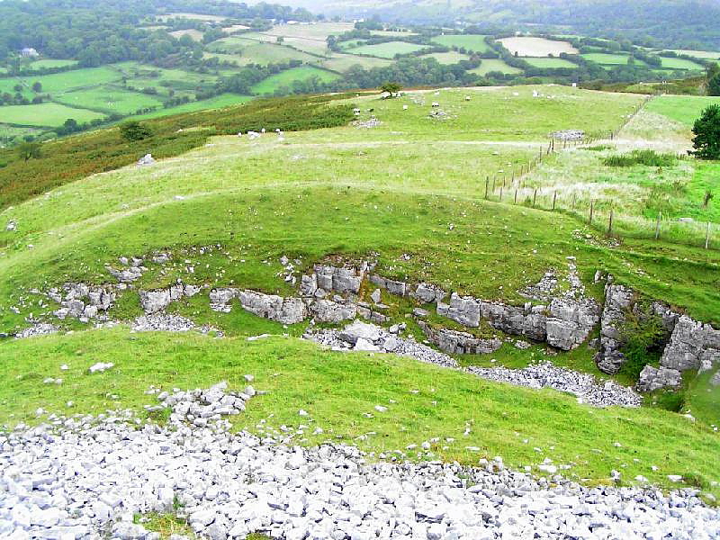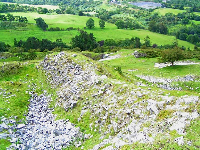 Within an Iron Age hillfort on a limestone ridge above the Taff Gorge and Merthyr Tydfil are the last traces of the large and strong castle begun in c1287 by Gilbert de Clare, earl of Gloucester on land claimed by Humphrey de Bohun, earl of Hereford. Warfare broke out between the earls in 1290 and they were severely admonished and fined by Edward I who had to march down from north Wales to intervene. The castle was captured by Madog ap Llywelyn in 1294. It was probably never fully completed and was too remote and exposed to serve as a residence. The Bucks' engraving of 1741, however, shows that fragments of the walls then still stood high.